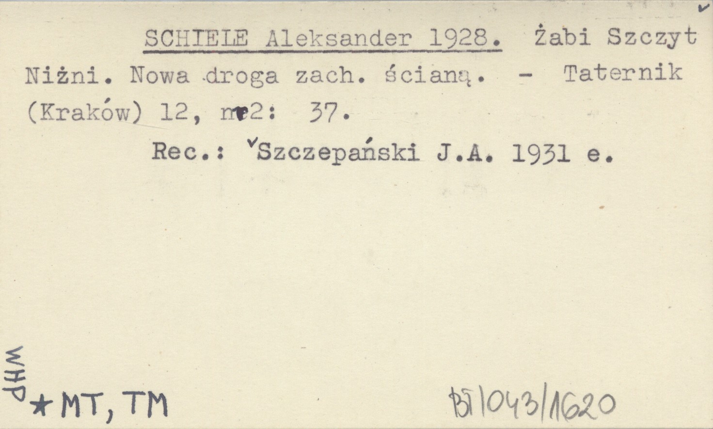 SCHIELE Aleksander 1928 Żabi Szczyt Niżni. Nowa droga zach. ścianą.