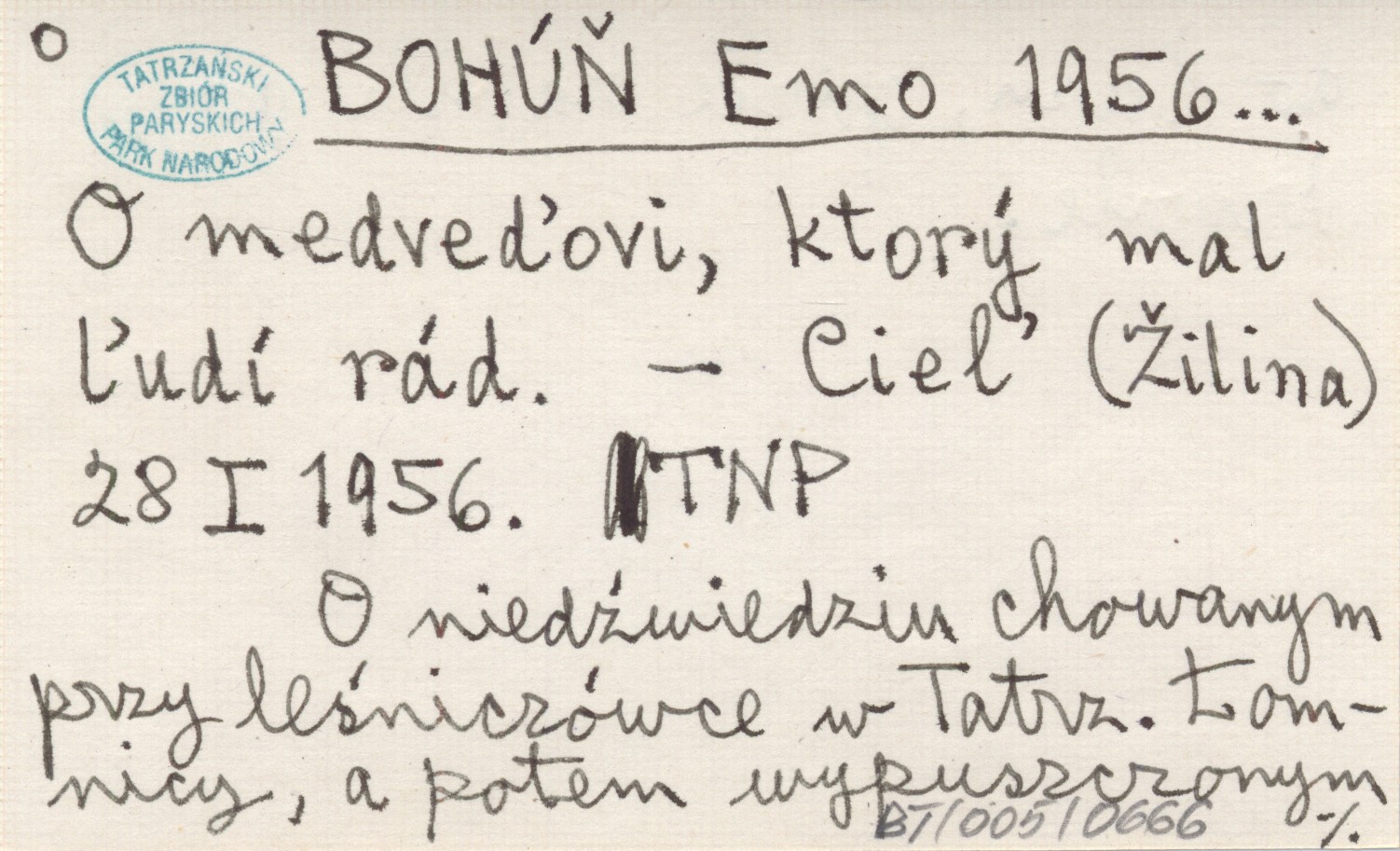 Cieľ (Žilina) , 28 I 1956. O niedźwiedziu chowanym przy leśniczówce w Tatrz. Łomnicy, a potem wypuszczonym do lasu, gdzie zabili go drwale.
