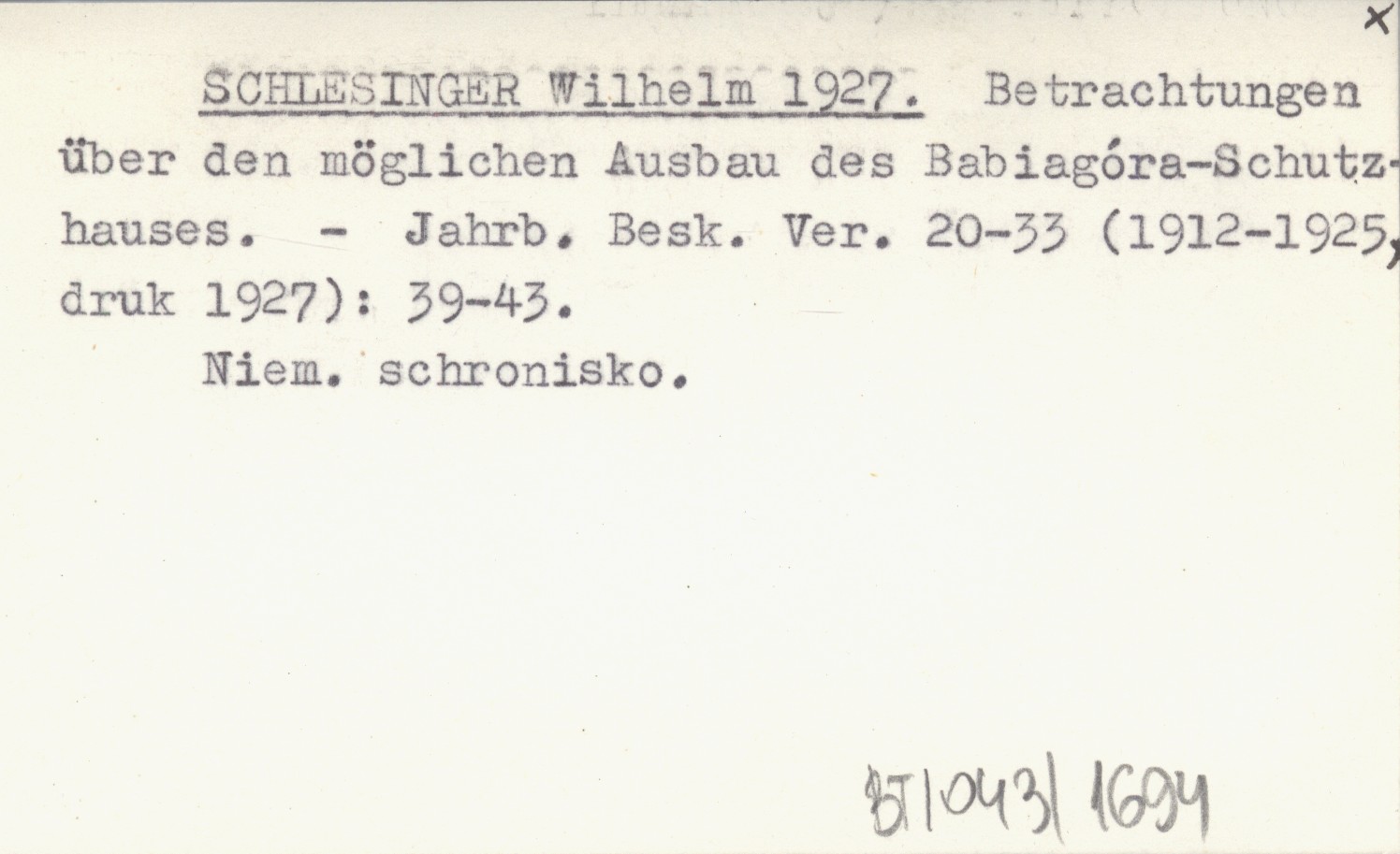 SCHLESINGER Wilhelm 1927 Betrachtungen über den möglichen Ausbau des Babiagóra-Schutzhauses.