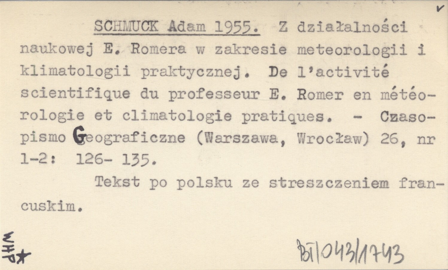 SCHMUCK Adam 1955 Z działalności naukowej E. Romera w zakresie meteorologii i klimatologii praktycznej. De l'activité scientifique du professeur E. Romer en météorologie et climatologie pratiques.