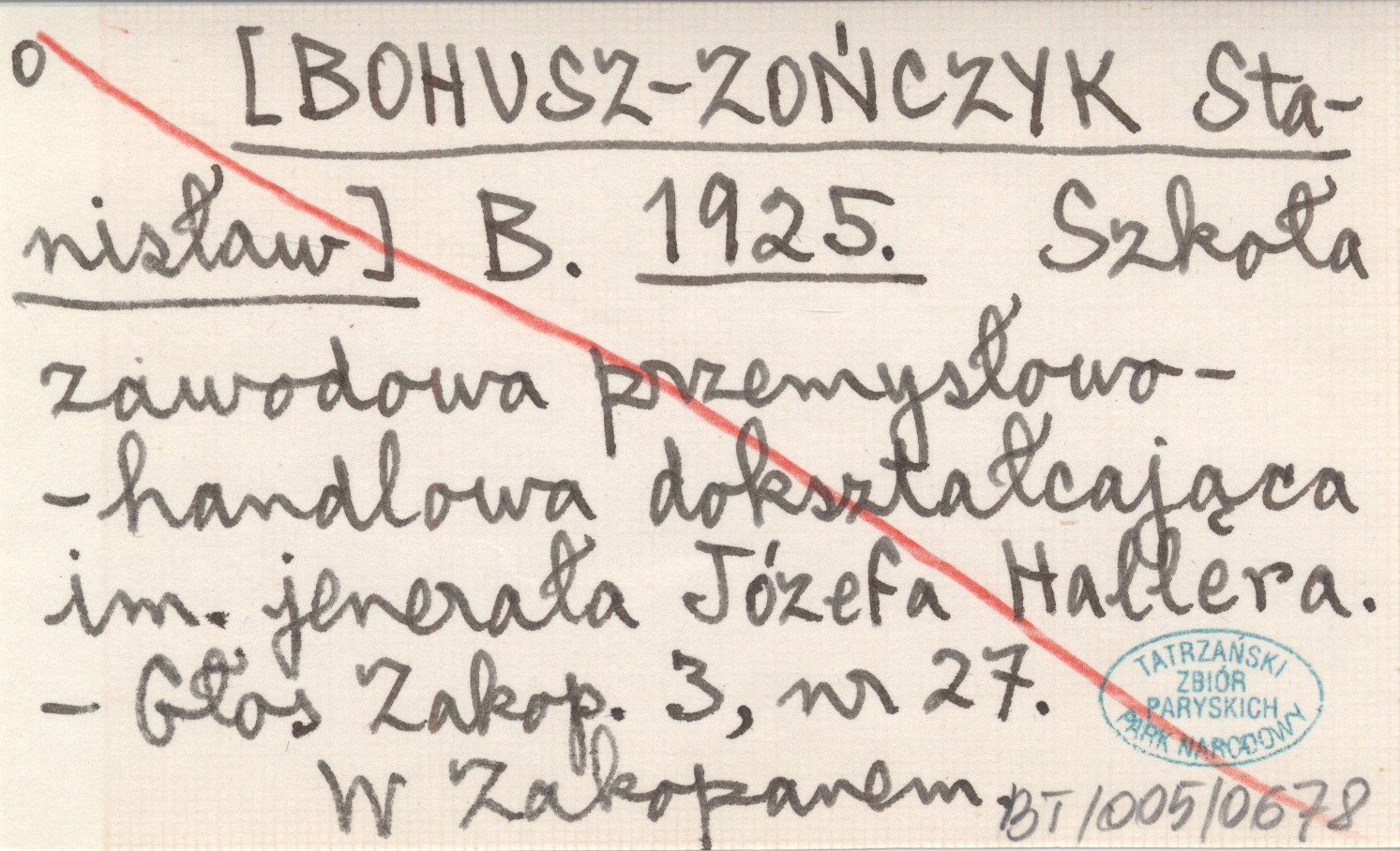 B. [BOHUSZ-ZOŃCZYK Stanisław] 1925 Szkoła zawodowa przemysłowo-handlowa dokształcająca im. jenerała Józefa Hallera.