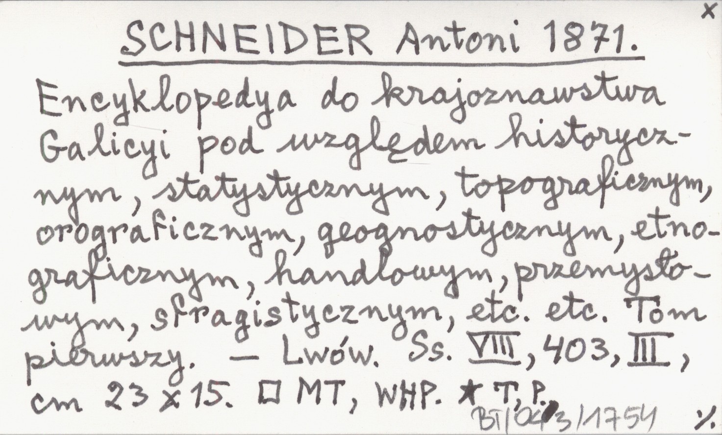 SCHNEIDER Antoni 1871 Encyklopedya do krajoznawstwa Galicyi pod względem historycznym, statystycznym, topograficznym, orograficznym, geognostycznym, etnograficznym, handlowym, przemysłowym, sfragistycznym, etc, etc. Tom pierwszy.