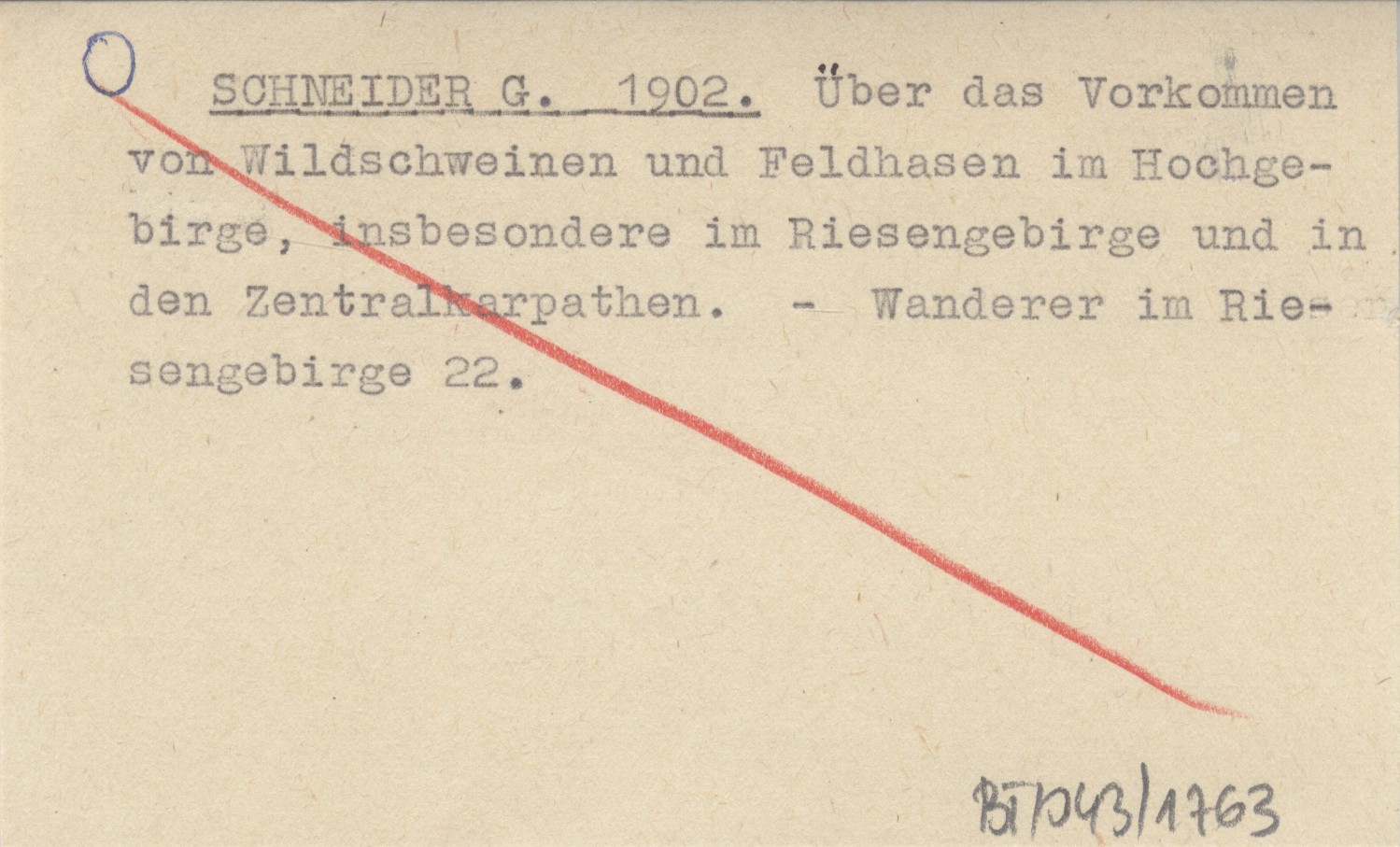 SCHNEIDER G. 1902 Über das Vorkommen von Wildschweinen und Feldhasen im Hochgebirge, insbesondere im Riesengeborge und in den Zentralkarpathen.