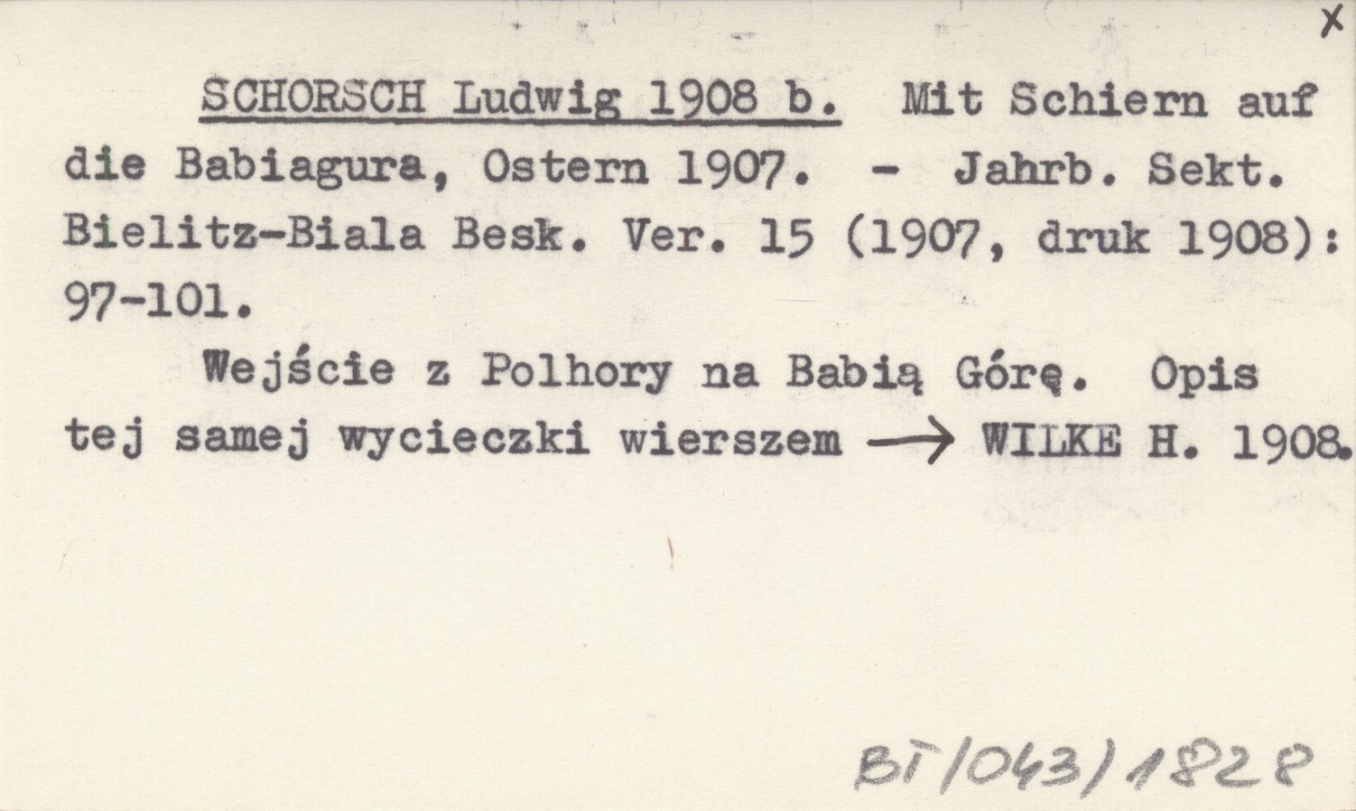 Jahresbericht der Sektion Bielitz-Biala des Beskiden-Vereines, 15 (1907, druk 1908): 97-101. Wejście z Polhory na Babią Górę. Opis tej samej wycieczki wierszem: WILKE H. 1908. WILKE H. 1908