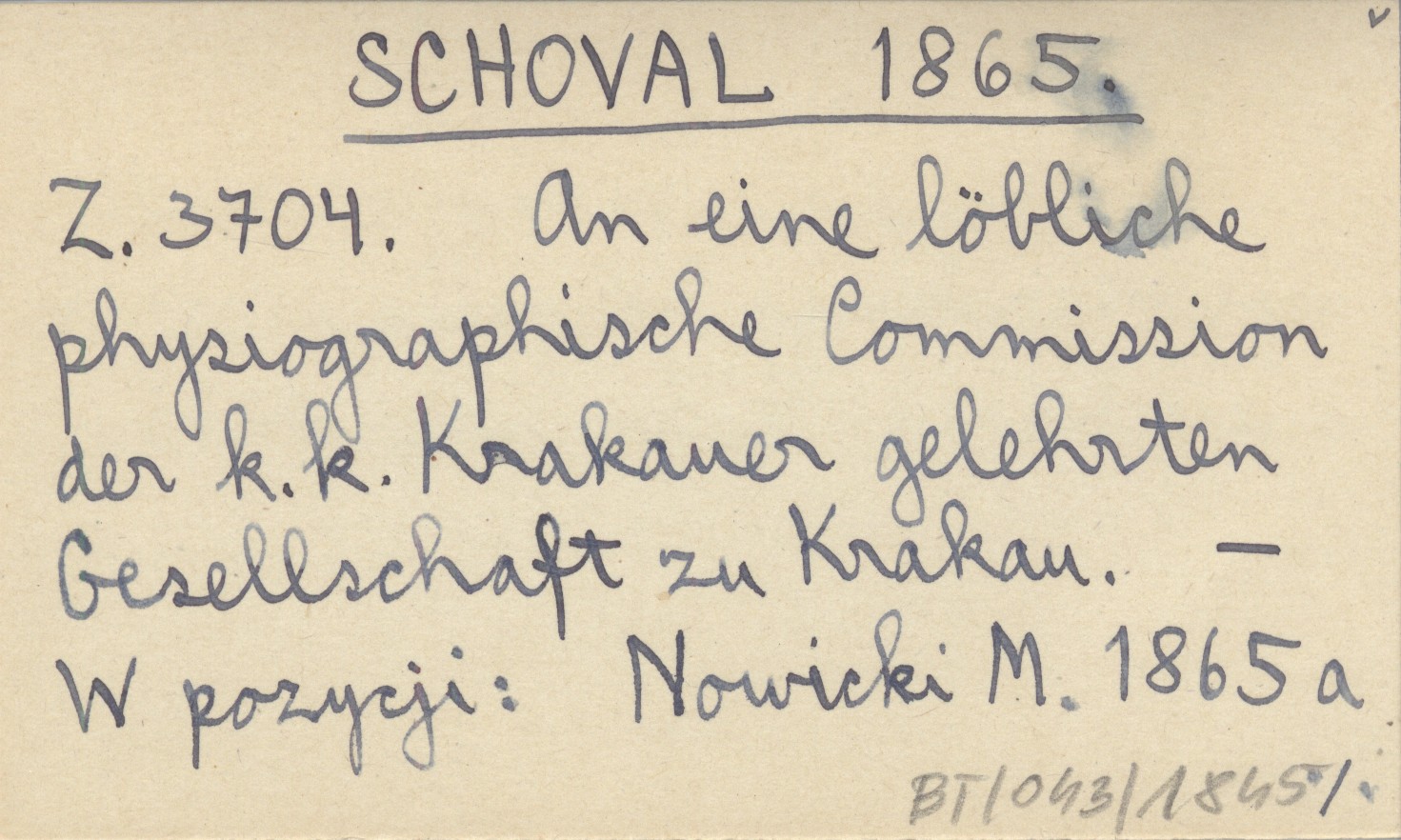 SCHOVAL 1865 Z. 3704. An eine löbliche physiographische Commission der k.k. Krakauer gelehrten Gesellschaft zu Krakau.