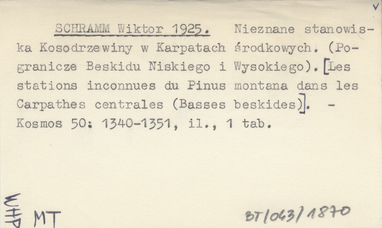 SCHRAMM Wiktor 1925 Nieznane stanowiska Kosodrzewiny w Karpatach środkowych. (Pogranicze Beskidu Niskiego i Wysokiego). [Les stations inconnues du Pinus montana dans les Carpathes centrales (Basses beskides)].