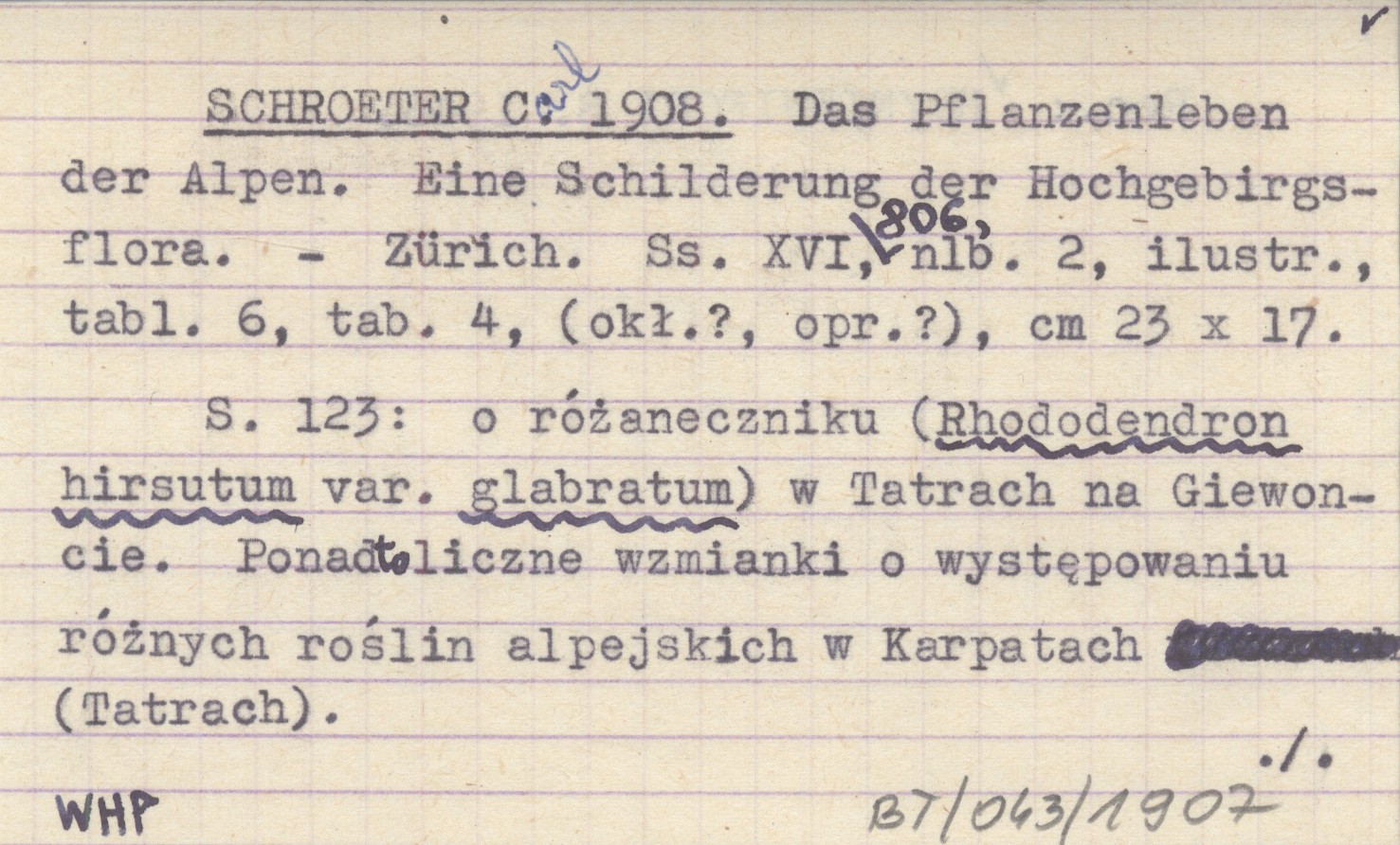 Zürich , XVI, 806, [2] s., il., 6 k., 4. tab., (okł.?, opr?), 23x17 cm. S. 123: o różaneczniku (Rhododendron hirsutum var. glabratum) w Tatrach na Giewoncie. Ponadto liczne wzmianki o występowaniu różnych roślin alpejskich w Karpatach (Tatrach). REC: HRYNIEWIECKI B. 1946.