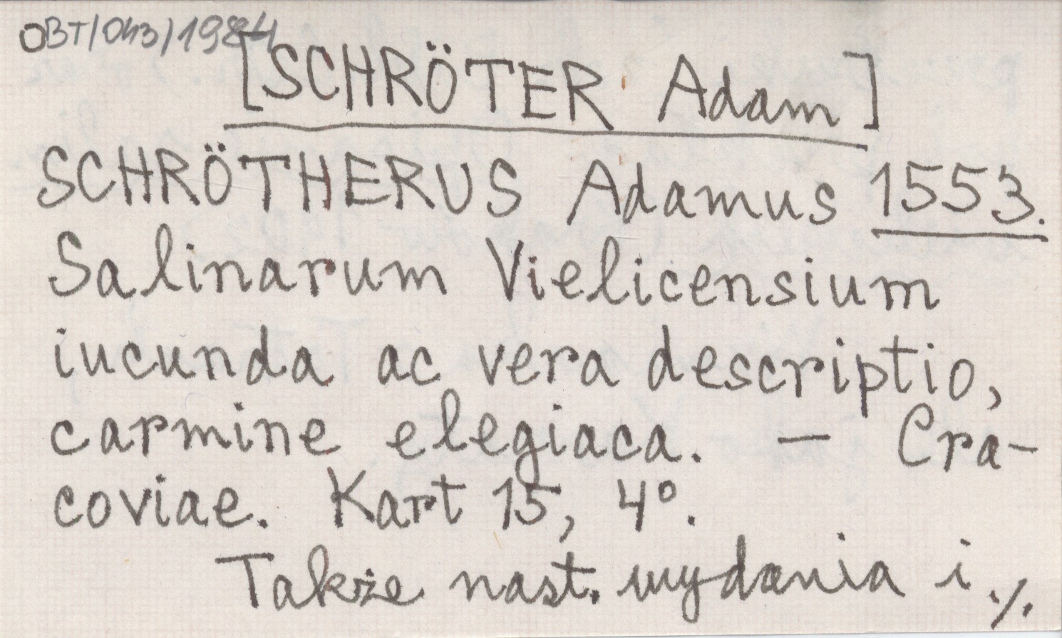 SCHRÖTHERUS Adamus [SCHRÖTER Adam] 1553 Salinarum Vielicensium iucunda ac vera descriptio carmine elegiaca.