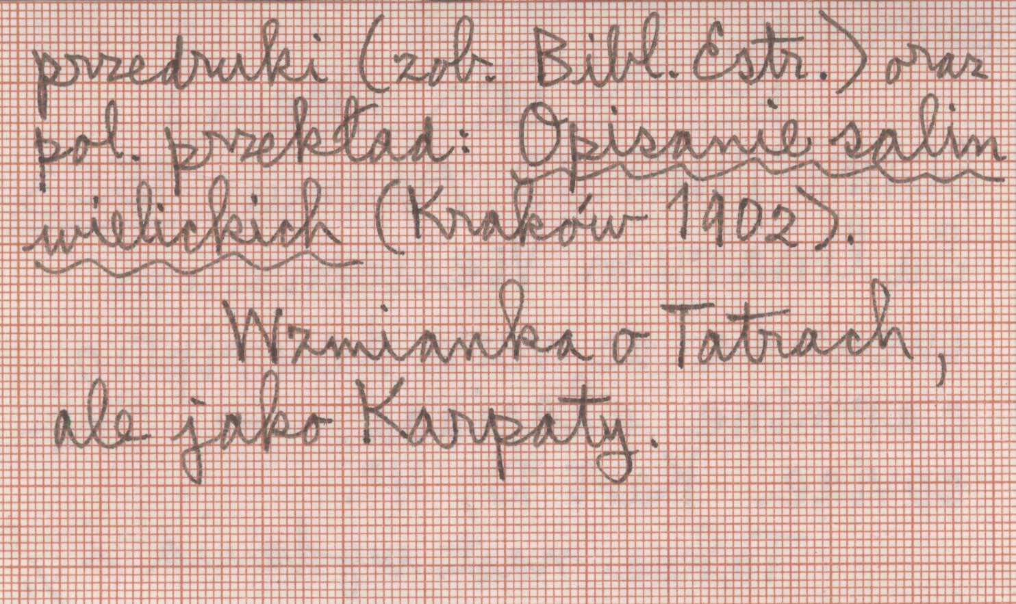 Cracoviae , 15 k., 4°. Wzmianka o Tatrach, ale jako Karpaty. Także następne wydania i przedruki (zob. Biblioteka Estreichera) oraz polski przekład: Opisanie salin wielickich (Kraków 1902).