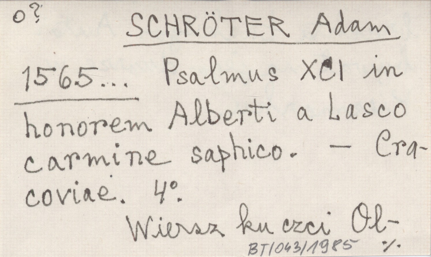 SCHRÖTER Adam 1565... Psalmus XCI in honorem Alberti a Lasco carmine saphico.