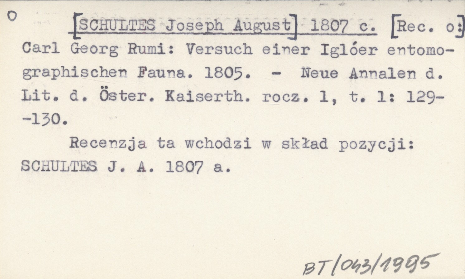 [SCHULTES Joseph August] 1807 c Carl Georg Rumi: Versuch einer Iglóer entomographischen Fauna. 1805.