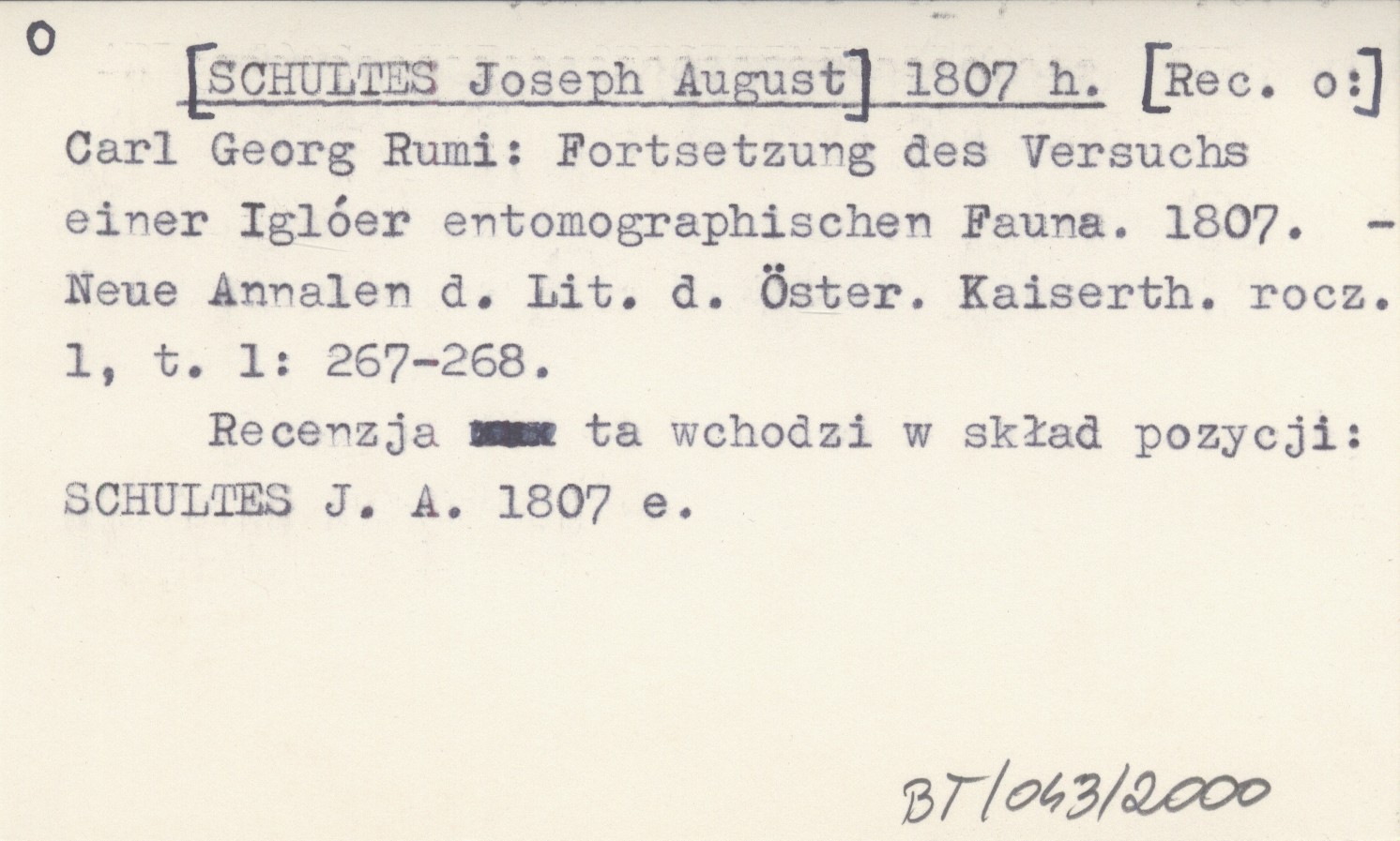 [SCHULTES Joseph August] 1807 h Carl Georg Rumi: Fortsetzung des Versuchs einer Iglóer entomographischen Fauna. 1807.