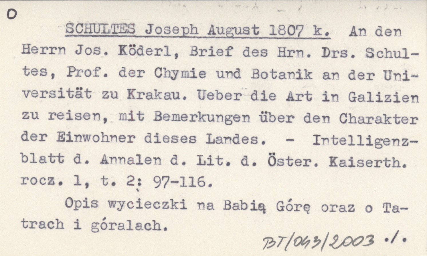 SCHULTES Joseph August 1807 k An den Herrn Jos. Köderl, Brief des Hrn. Drs. Schultes, Prof. der Chymie und Botanik an der Universität zu Krakau. Ueber die Art in Galizien zu reisen, mit Bemerkungen über den Charakter der Einwohner dieses Landes.
