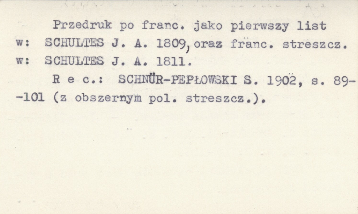Intelligenblatt d. Annalen d. Lit. d. Öster Kaisereth., R. 1, t. 2: 97-116. Opis wycieczki na Babią Górę oraz o Tatrach i góralach. Przedruk po francusku jako pierwszy list w: SCHULTES J. A. 1809, oraz francuskie streszczenie w: SCHULTES J. A. 1811. REC: SCHNÜR-PEPŁOWSKI S. 1902: 89-101 (z obszernym polskim streszczeniem).