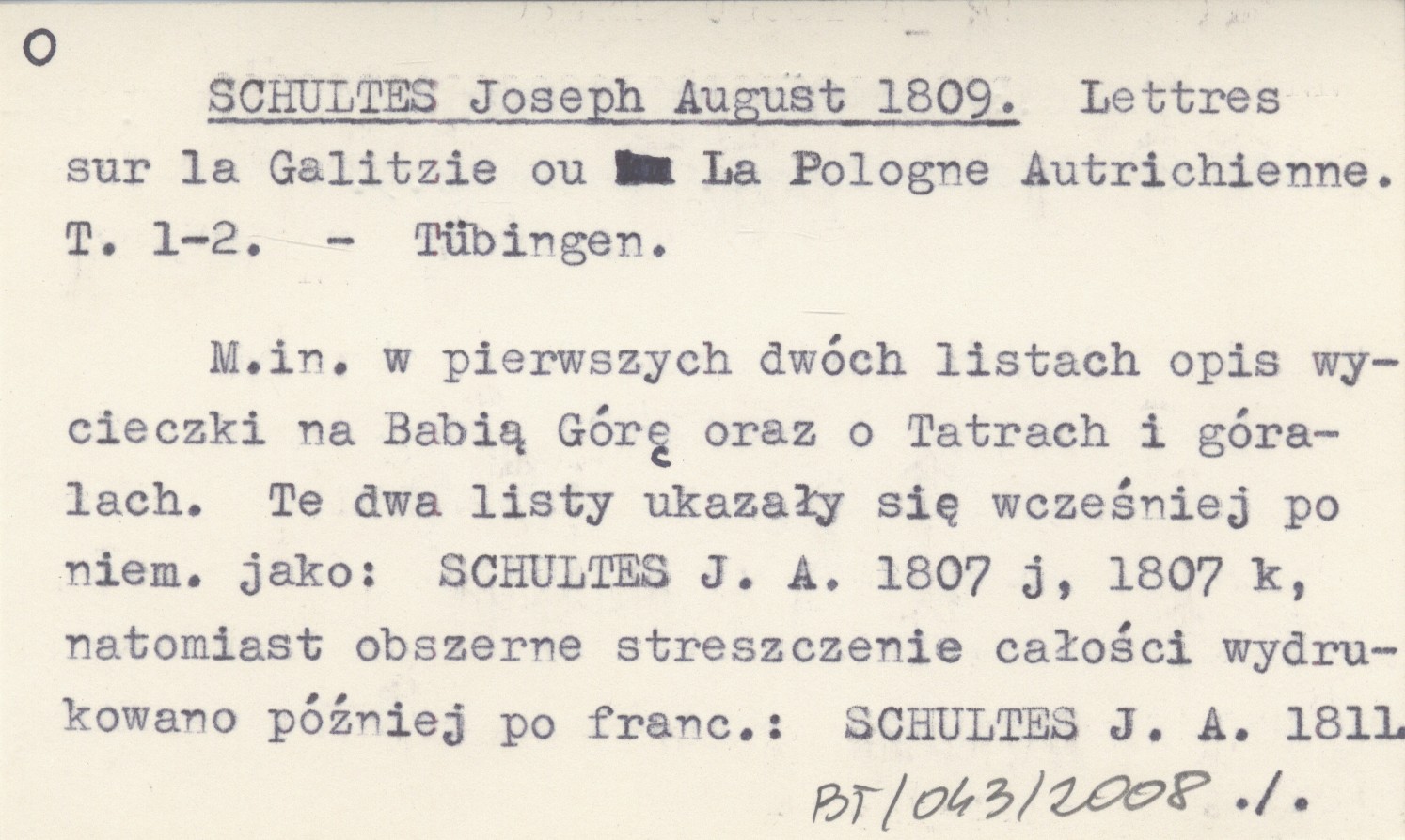 Tübingen , M. in. w pierwszych dwóch listach opis wycieczki na Babią Górę oraz o Tatrach i góralach. Te dwa listy ukazały się wcześniej po niemiecku jako: SCHULTES J. A. 1807 j, 1807 k, natomiast obszerne streszczenie całości wydrukowano później po francusku: SCHULTES J. A. 1811. REC: SCHNÜR-PEPŁOWSKI S. 1902: 88-142 (z obszernym polskim streszczeniem).