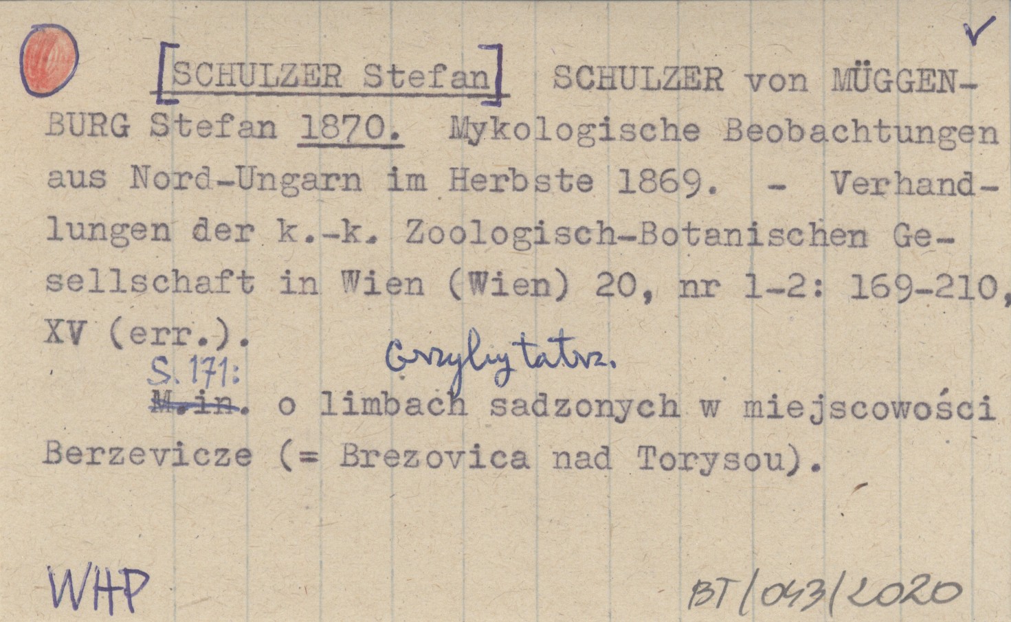Verhandlungen der kaiserlich-königlichen Zoologisch-Botanischen Gesellschaft in Wien (Wien) , 20, nr 1-2: 169-210, XV (err.). Grzyby tatrzańskie. S. 171: o limbach sadzonych w miejscowosci Berzevicze (= Brezovica nad Torysou).