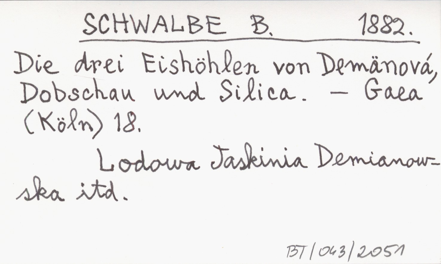 SCHWALBE B. 1882 Die drei Eishöhlen von Demänová, Dobschau und Silica.