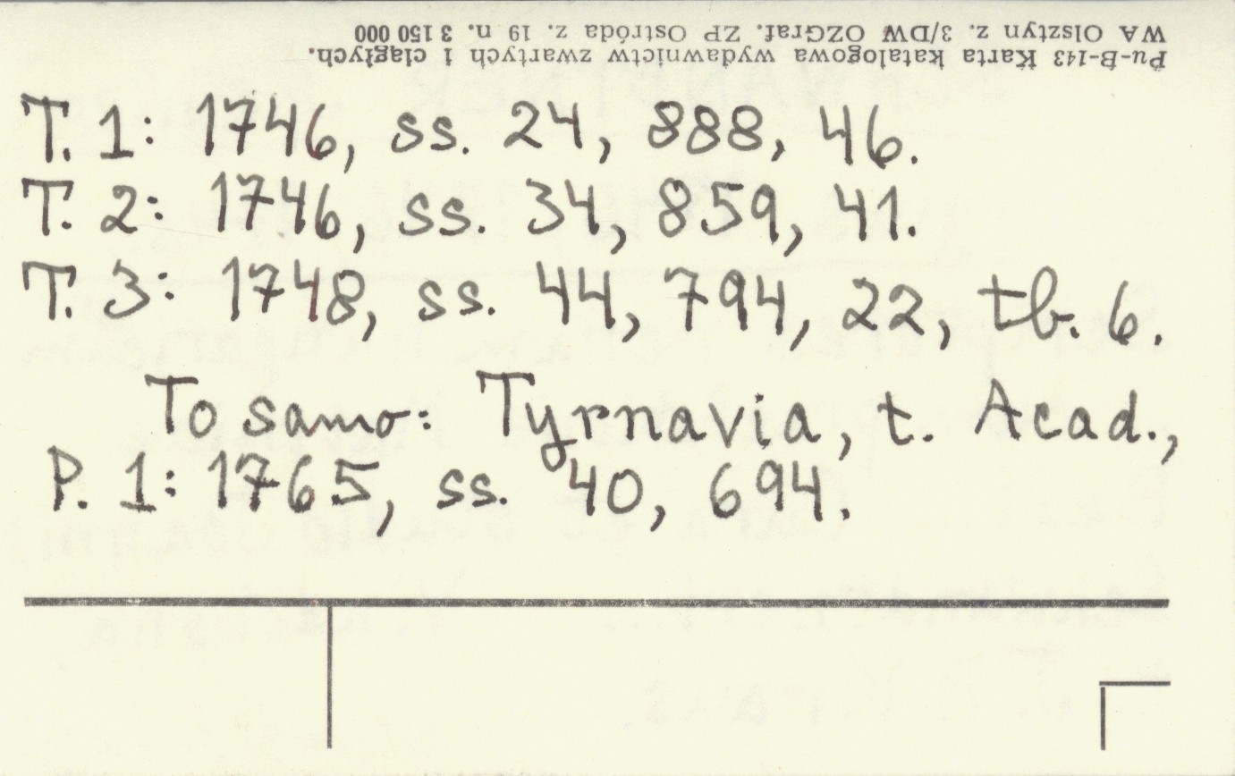 Vindobona, t. J. P. Kraus, T. 1, 1746: 24, 888, 46 s.; t. 2, 1746: 34, 859, 41 s.; t. 3, 1748: 44, 794, 22 s., 6 k. To samo: Tyrnavia, t. Acad., P. 1, 1765: 40, 694 s.