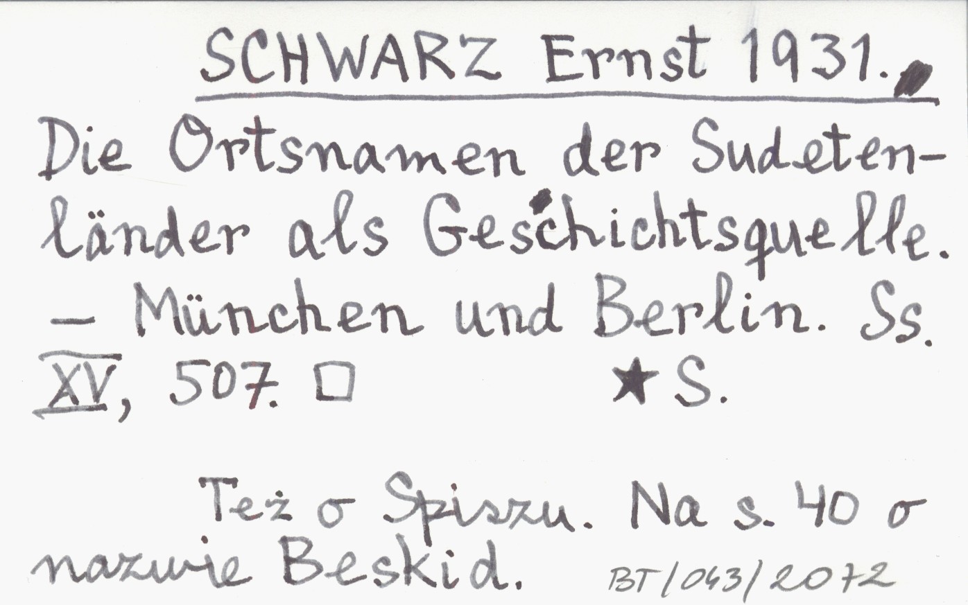 SCHWARZ Ernst 1931 Die Ortsnamen der Sudetenländer als Geschocgtsquelle.