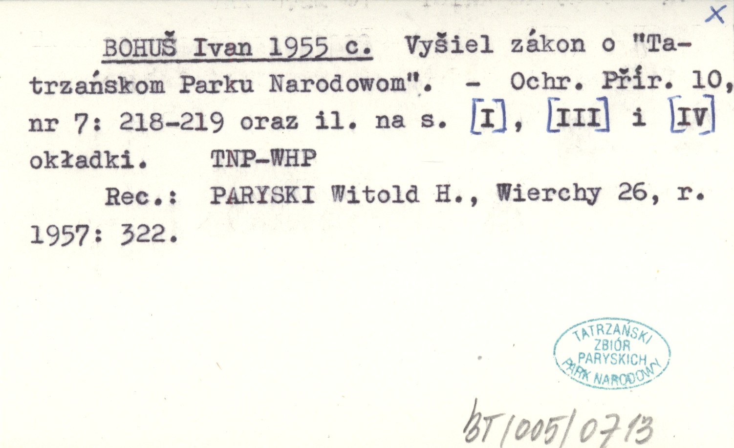 Ochr. Přír., 10, nr 7: 218-219, il. na s. [I], [III] i [IV] okł. REC: PARYSKI Witold H., Wierchy 26, r. 1957: 322.