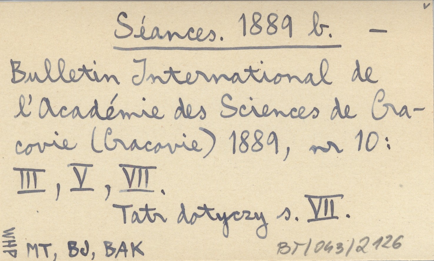 Bulletin International de l'Académie des Sciences de Cracovie (Cracovie) , 1889, nr 10: III, V, VII. Tatr dotyczy s. VII.