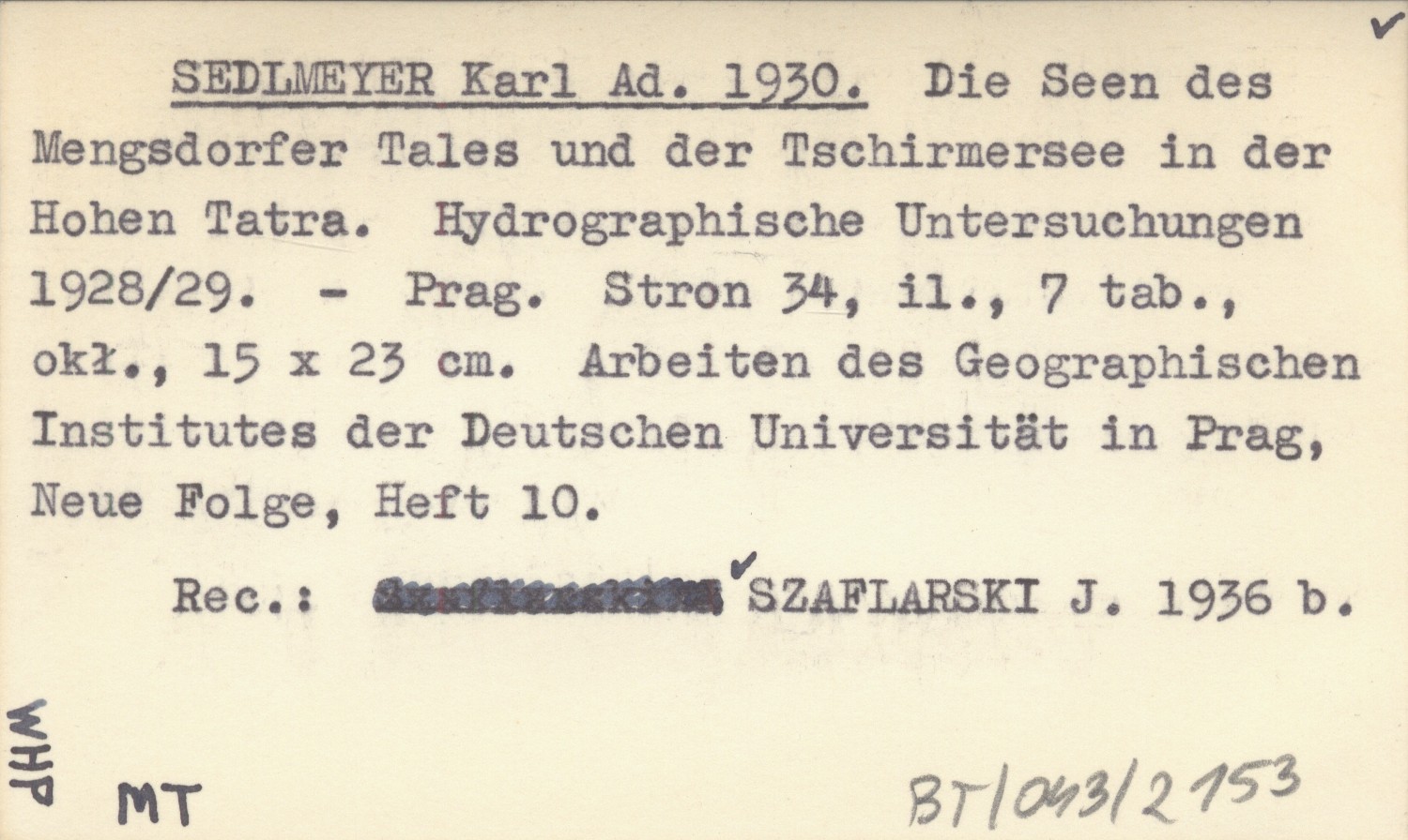 SEDLMEYER Karl Ad. 1930 Die Seen des Mengsdorfer Tales und der Tschirmersee in der Hohen Tatra. Hydrographische Untersuchungen 1928/29.