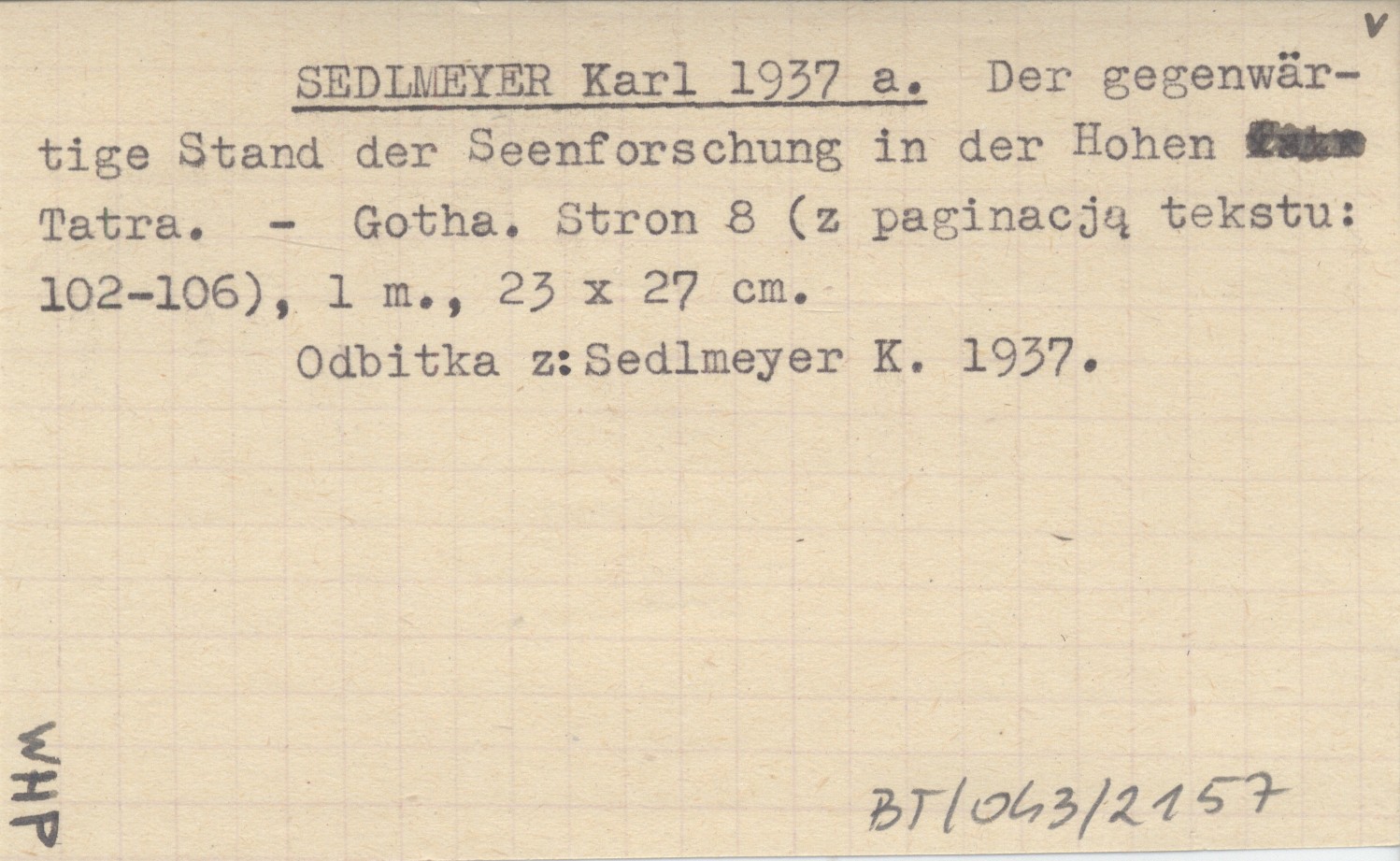 SEDLMEYER Karl 1937 a Der gegenwärtige Stand der Seenforschung in der Hohen Tatra.
