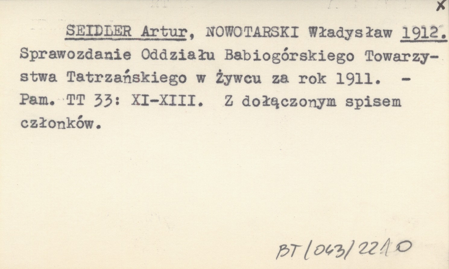 SEIDLER Artur NOWOTARSKI, Władysław. ; 1912 Sprawozdanie Oddziału Babiogórskiego Towarzystwa Tatrzańskiego w Żywcu za rok 1911.