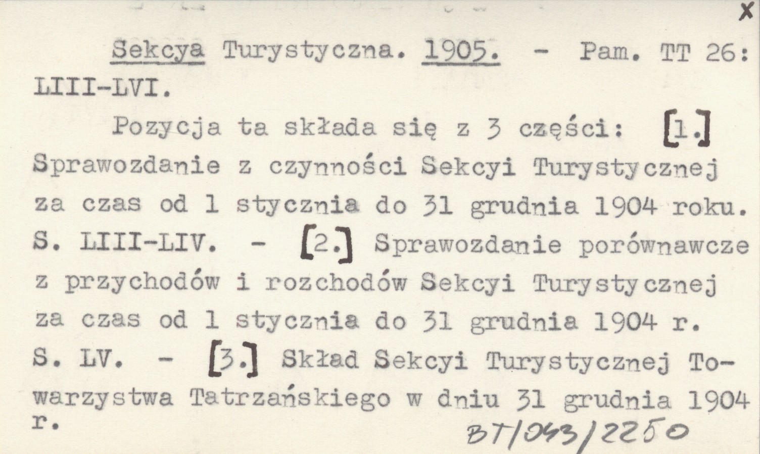 Pamiętnik Towarzystwa Tatrzańskiego, 26: LIII-LVI. Pozycja ta składa się z 3 części: [1.] Sprawozdanie z czynności Sekcyi Turystycznej za czas od 1 stycznia do 31 grudnia 1904 roku. S. LIII-LIV. [2.] Sprawozdanie porównawcze z przychodów i rozchodów Sekcyi Turystycznej za czas od 1 stycznia do 31 grudnia 1904 roku. S. LV. [3.] Skład Sekcyi Turystycznej Towarzystwa Tatrzańskiego w dniu 31 grudni 1904 r.