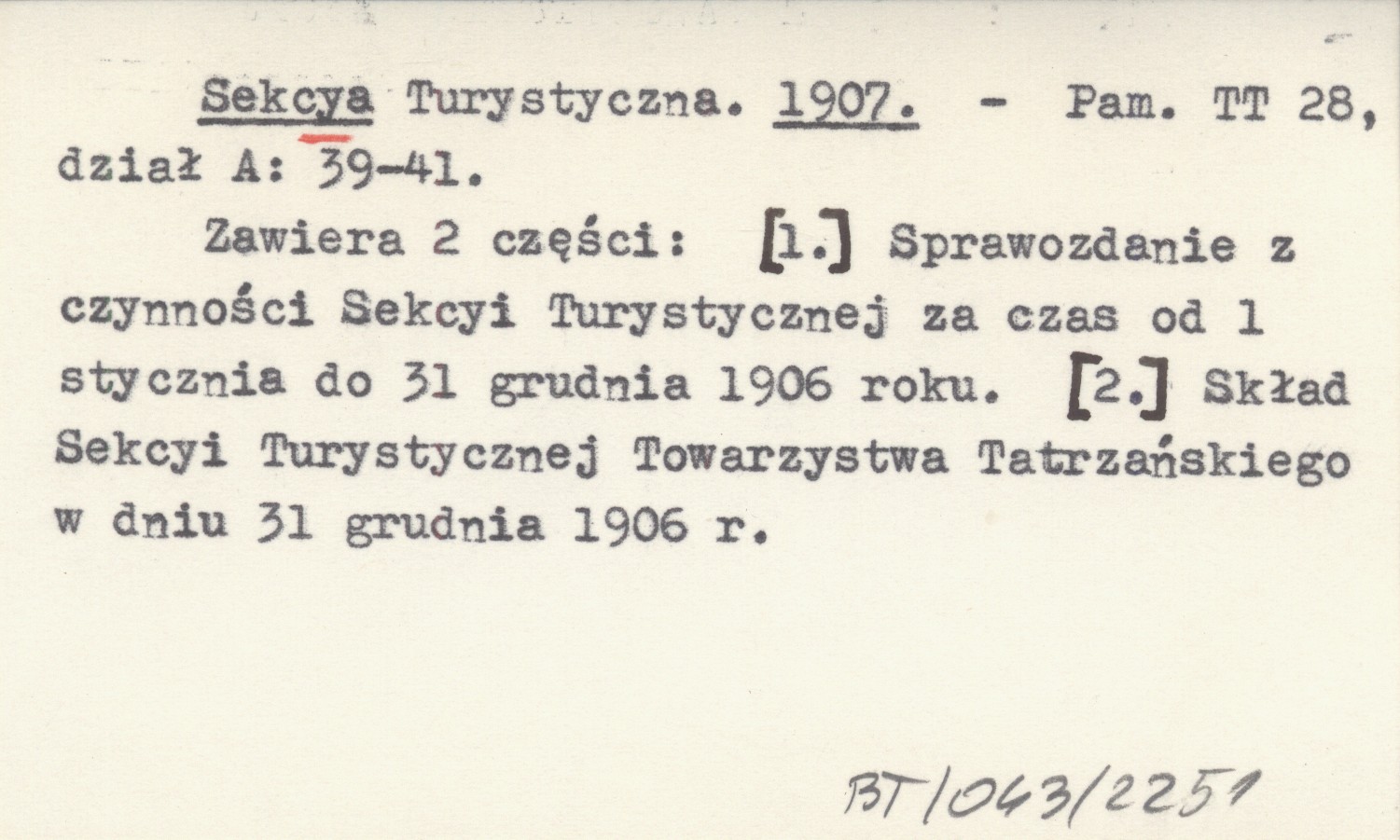Pamiętnik Towarzystwa Tatrzańskiego, 28, dz. A: 39-41. Zawiera 2 części: [1.] Sprawozdanie z czynności Sekcyi Turystycznej za czas od 1 stycznia do 31 grudnia 1906 roku. [2.] Skład Sekcyi Turystycznej Towarzystwa Tatrzańskiego w dniu 31 grudnia 1906 r.