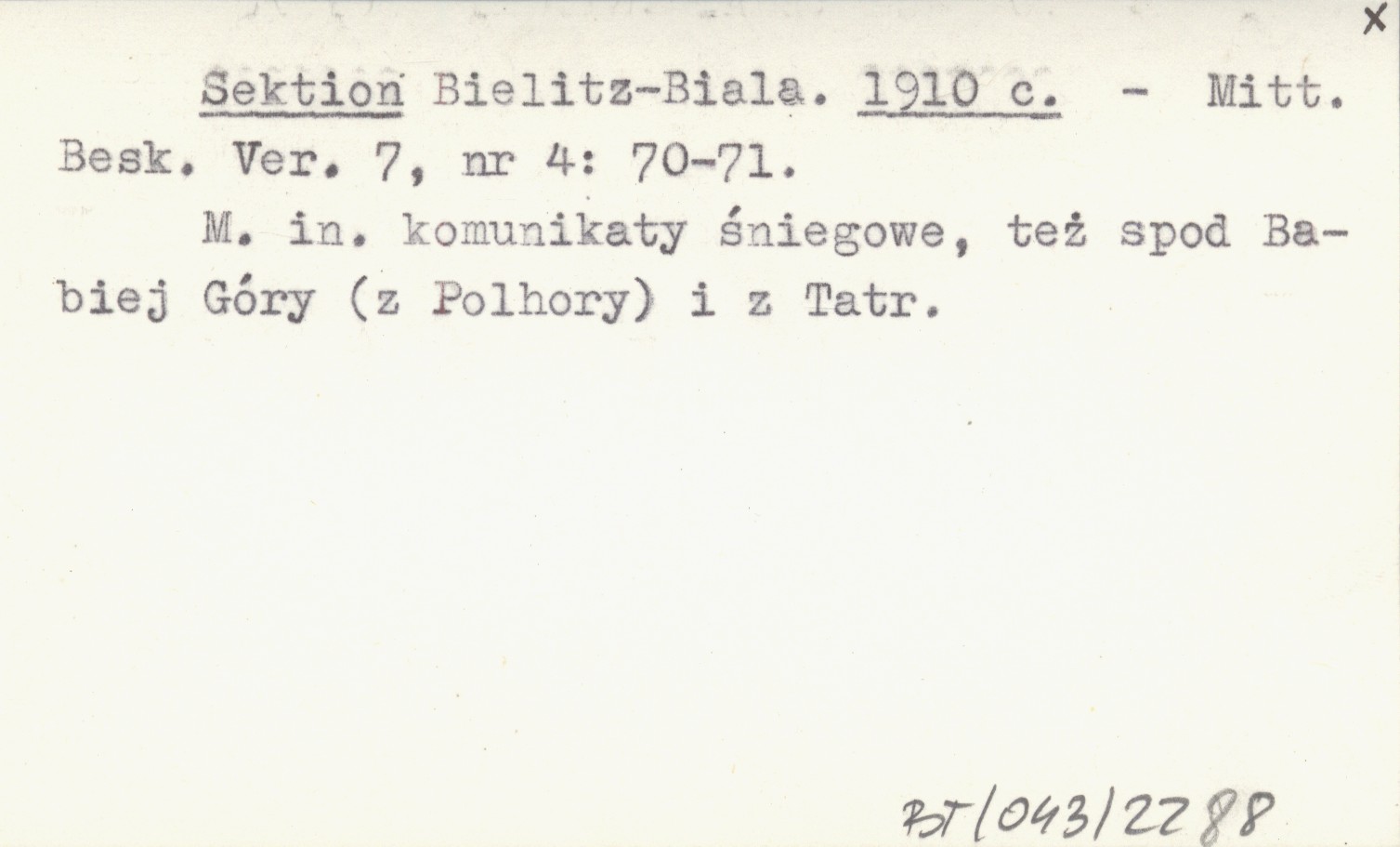 Mitteilungen des Beskidenvereines, 7, nr 4: 70-71. M. in. komunikaty śniegowe, też spod Babiej Góry (z Polhory) i z Tatr.