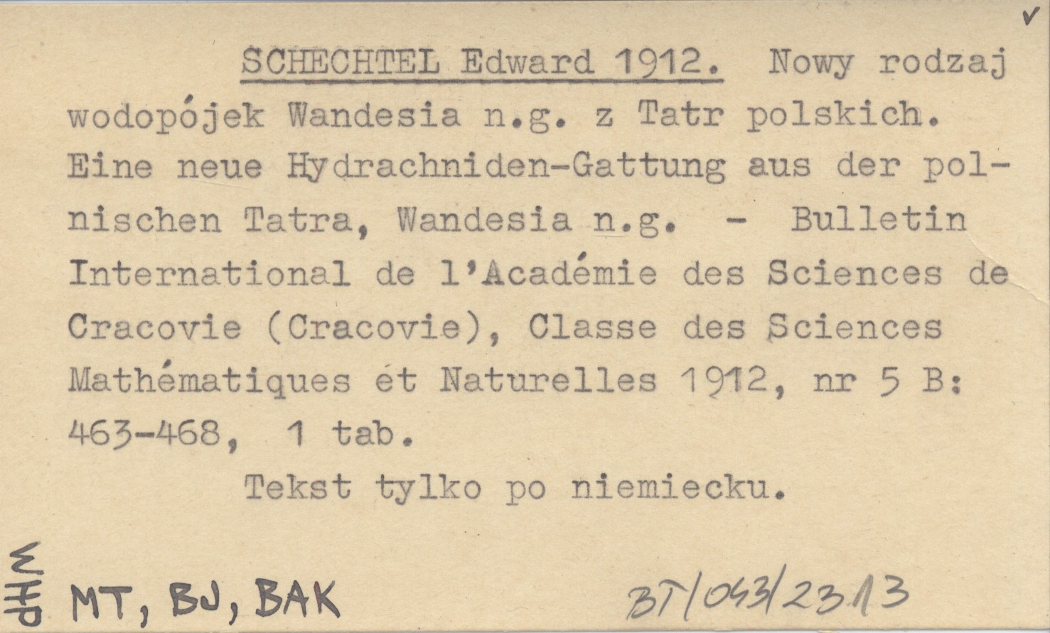 SCHECHTEL Edward 1912 Nowy rodzaj wodopójek Wandesia n.g. z Tatr polskich. Eine neue Hydrachniden-Gattung aus der polnischen Tatra, Wandesia n.g.