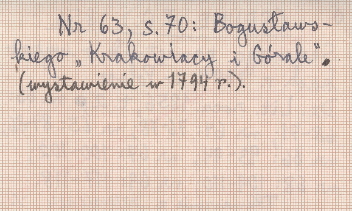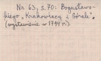 Dziennik Literacki, R. 1856, t. 2, nr 63: 68-71; nr 64: 76-78; nr 65: 84-86; nr 66: 93-94; nr 67: 100-102; nr 68: 109-110; nr 69: 117-118. Nr 63, s. 70: Bogusławskiego "Krakowiacy i Górale" *wystawienie w 1794 r.). Tłumaczenie.