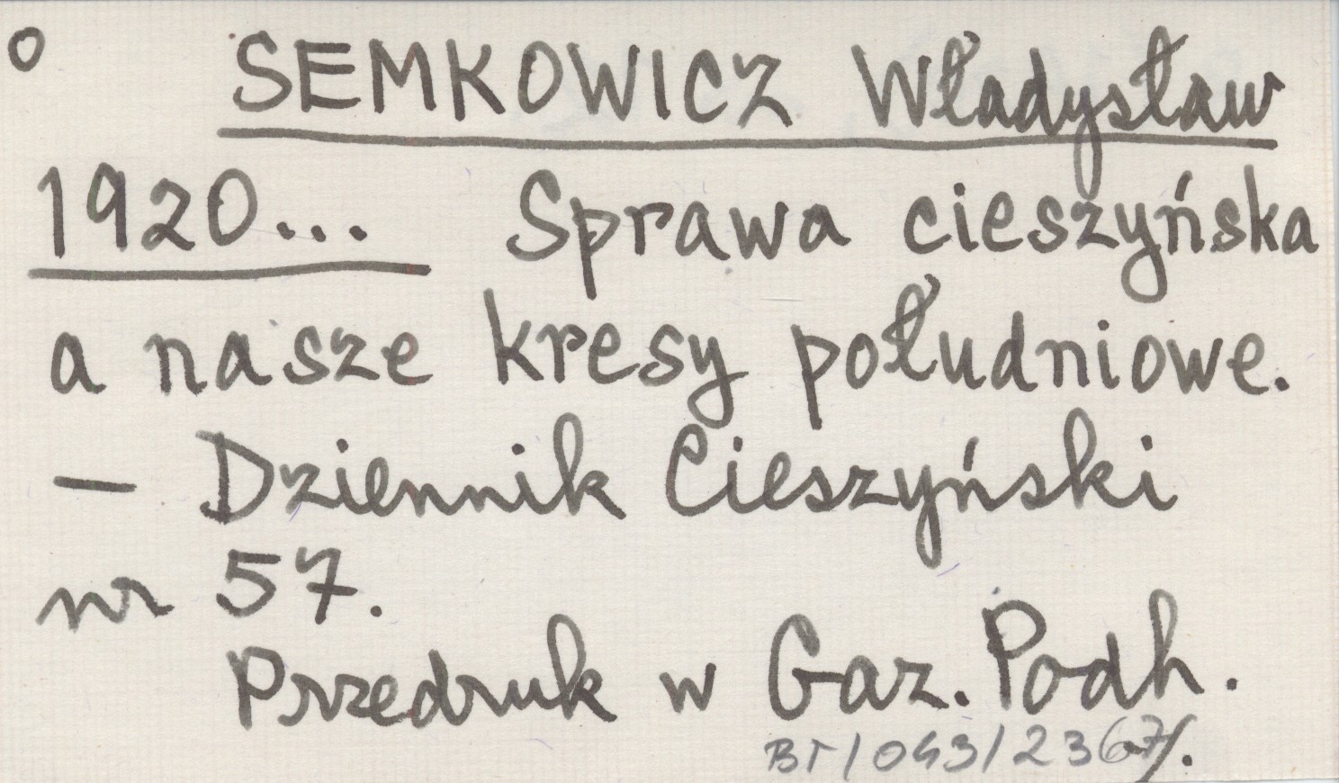 SEMKOWICZ Władysław 1920... Sprawa cieszyńska a nasze kresy południowe.