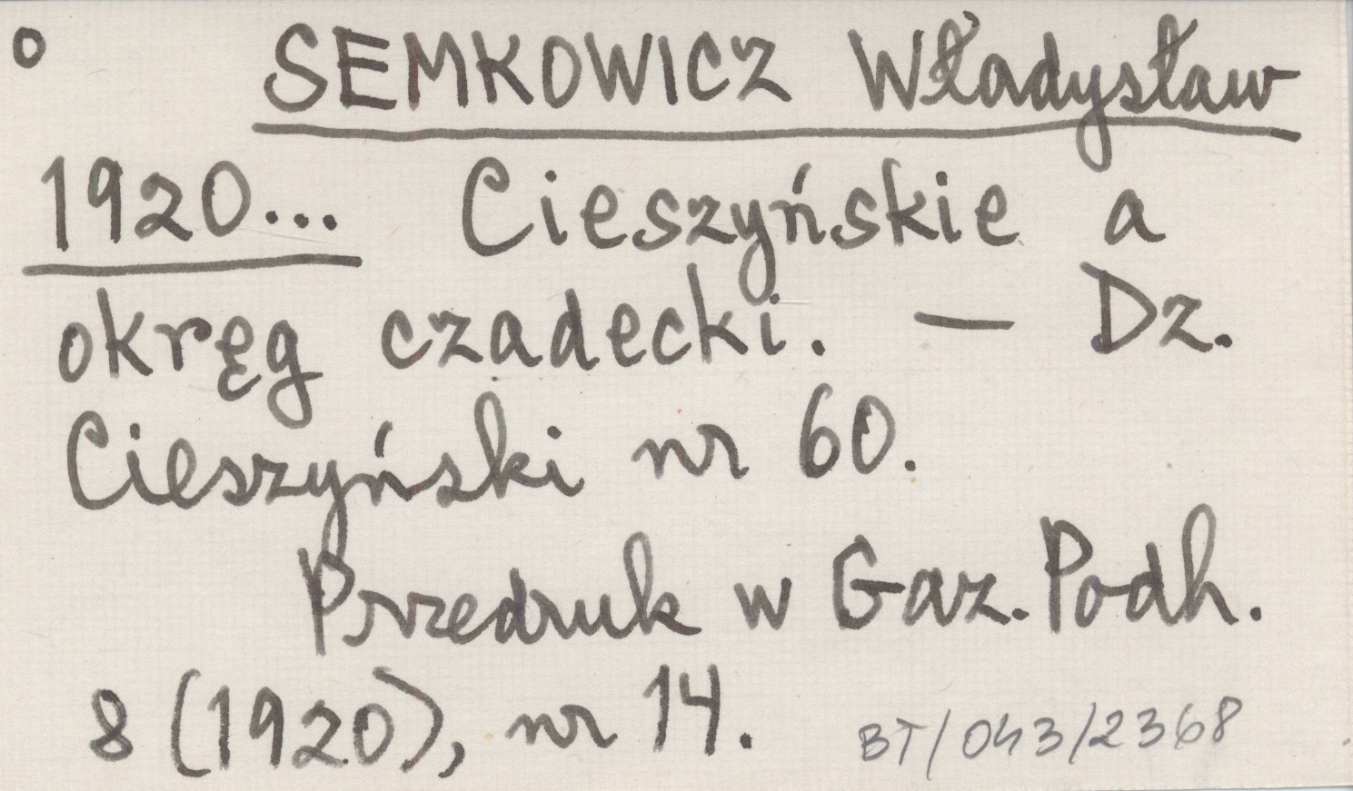 SEMKOWICZ Władysław 1920... Cieszyńskie a okręg czadecki.