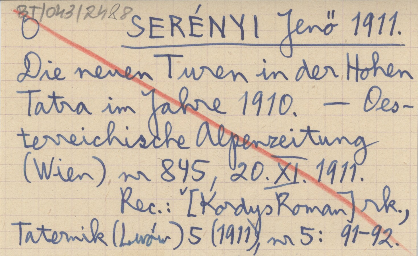 Oesterreichische Alpenzeitung (Wien) , Nr 845, 20.XI.1911. REC: [Kordys Roman] rk., Taternik (Lwów) 5 (1911), nr 5: 91-92.
