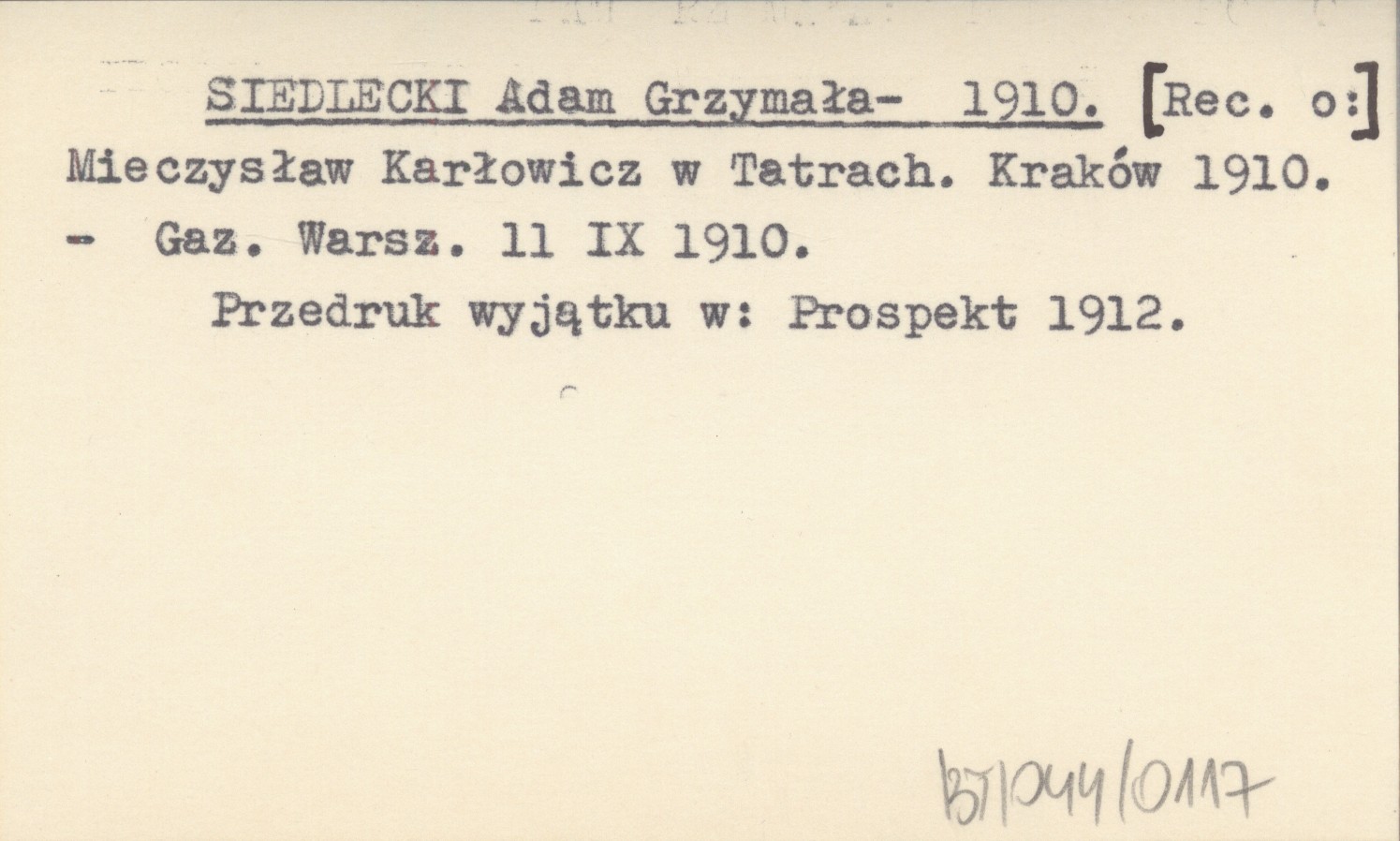 SIEDLECKI Adam Grzymała- 1910 Mieczysław Karłowicz w Tatrach. Kraków 1910.
