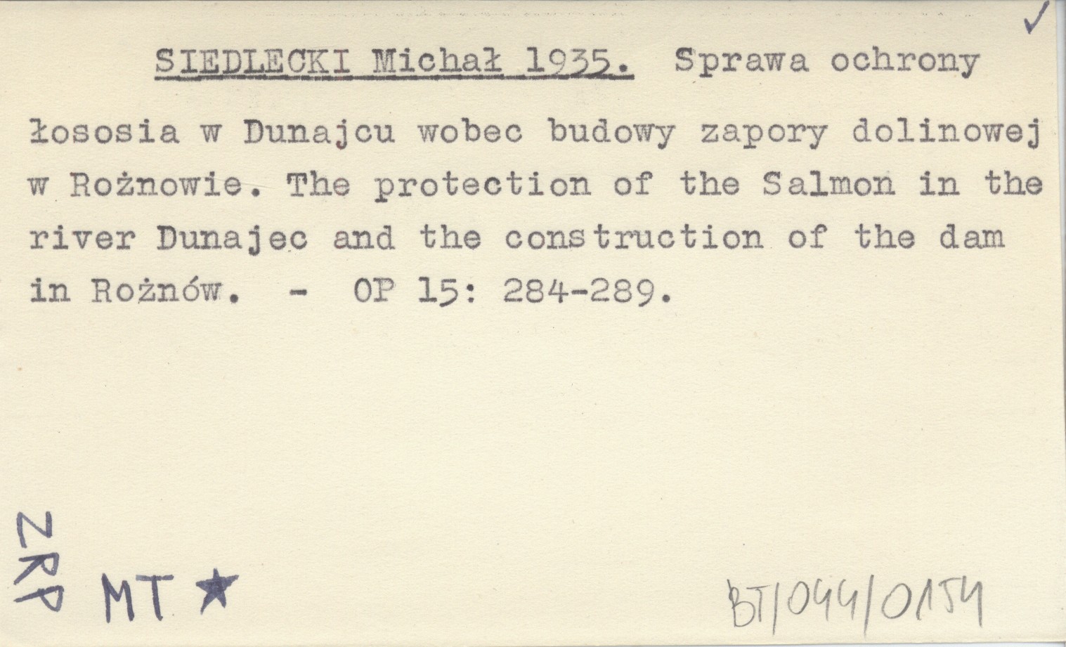 SIEDLECKI Michał 1935 Sprawa ochrony łososia w Dunajcu wobec budowy zapory dolinowej w Rożnowie. The protection of the Salmon in the river Dunajec and the construction of the dam in Rożnów.