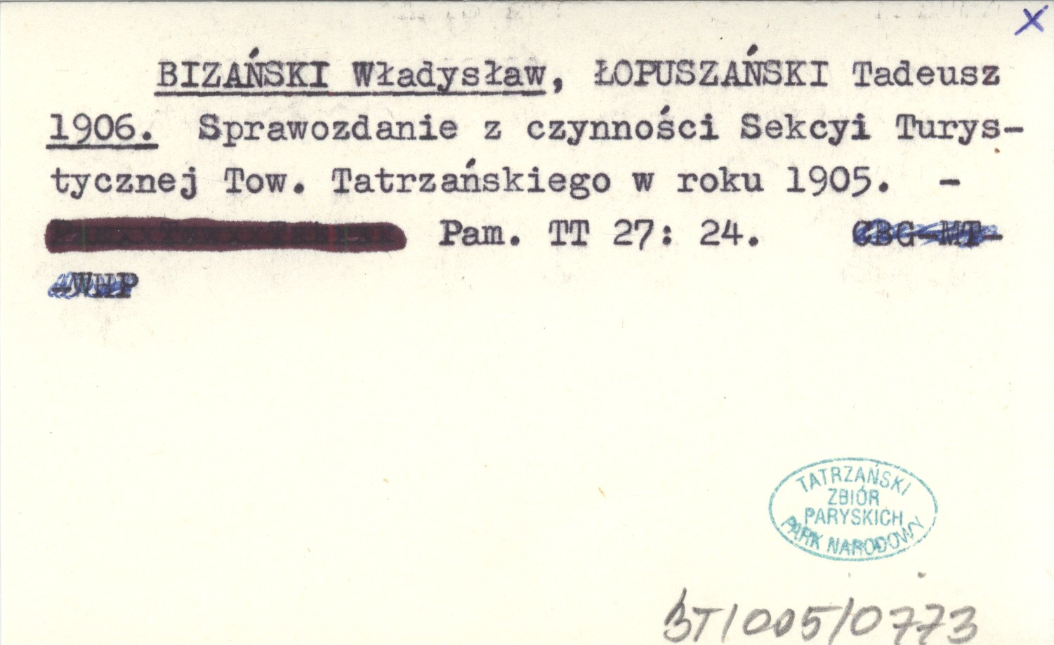 BIZAŃSKI Władysław ŁOPUSZAŃSKI, Tadeusz. ; 1906 Sprawozdanie z czynności Sekcyi Turystycznej Tow. Tatrzańskiego w roku 1905.
