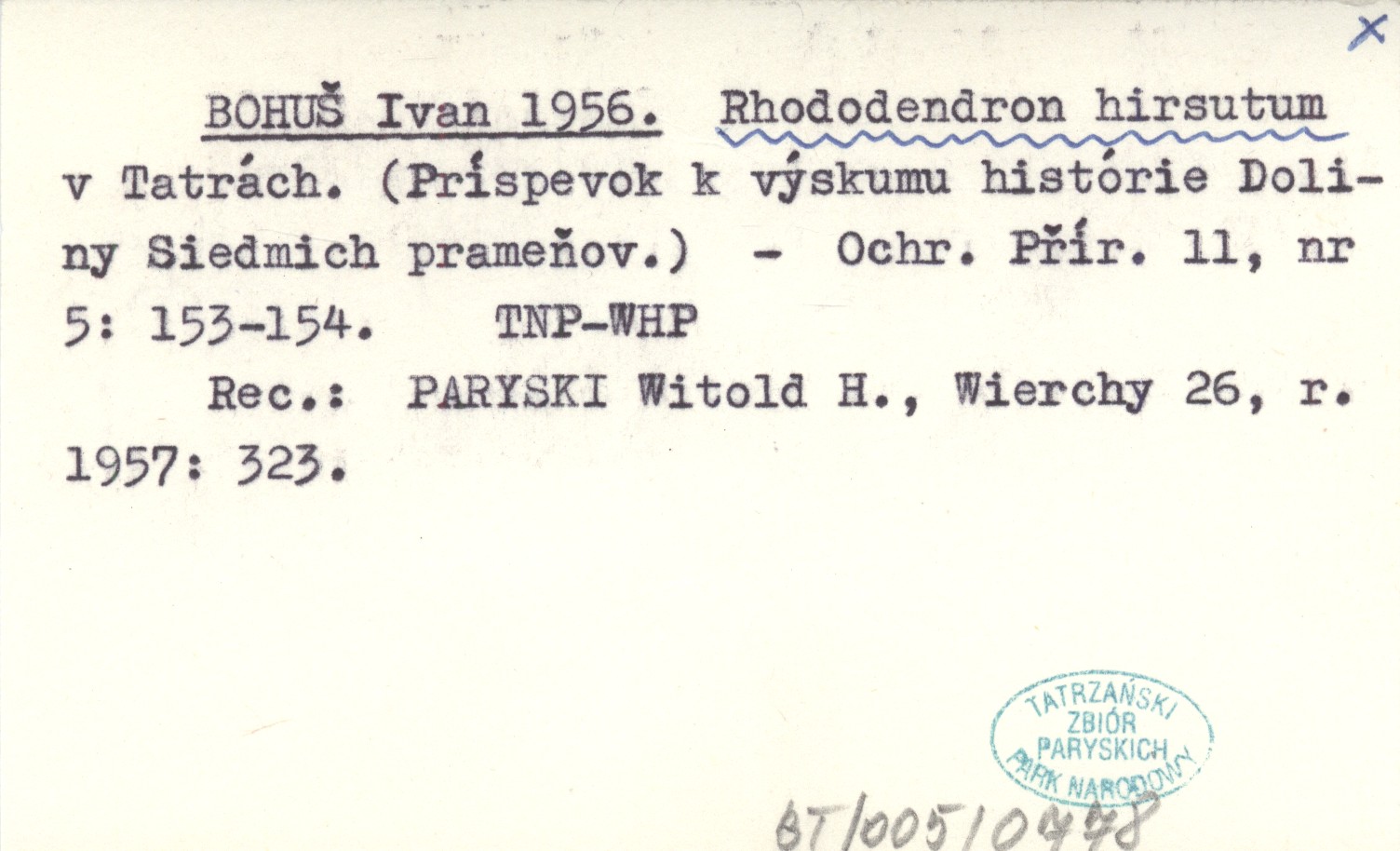 BOHUŠ Ivan 1956 Rhododendron hirsutum v Tatrách. (Príspevok k výskumu histórie Doliny Siedmich prameňov.).