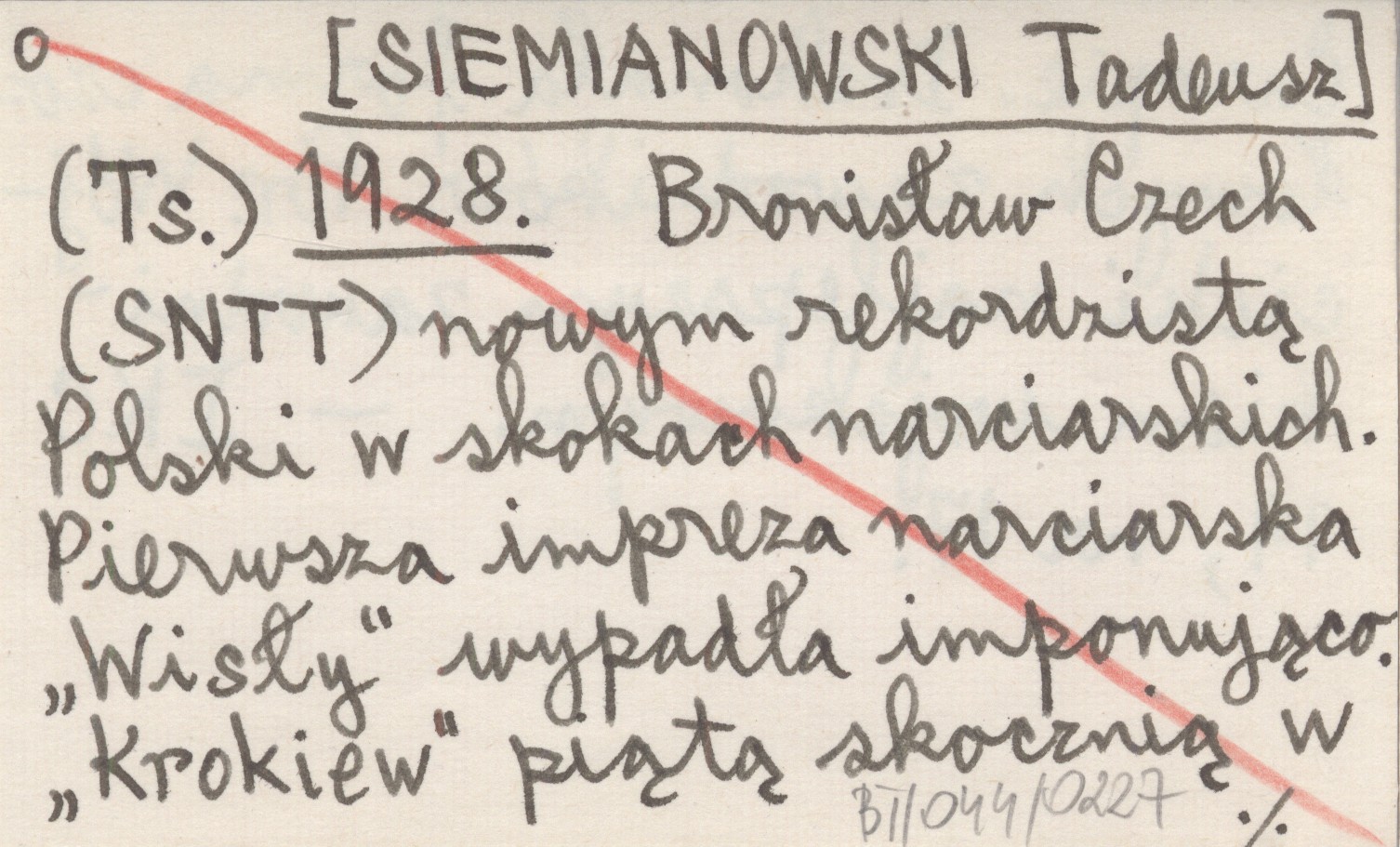(Ts.) [SIEMIANOWSKI Tadeusz] 1928 Bronisław Czech (SNTT) nowym rekordzistą Polski w skokach narciarskich. Pierwsza impreza narciarska "Wisły" wypadła imponująco. "Krokiew" piątą skocznią w Europie. Doskonała forma czołowych zawodników. Por. Wójcicki najlepszym zawodnikiem wojskowym.