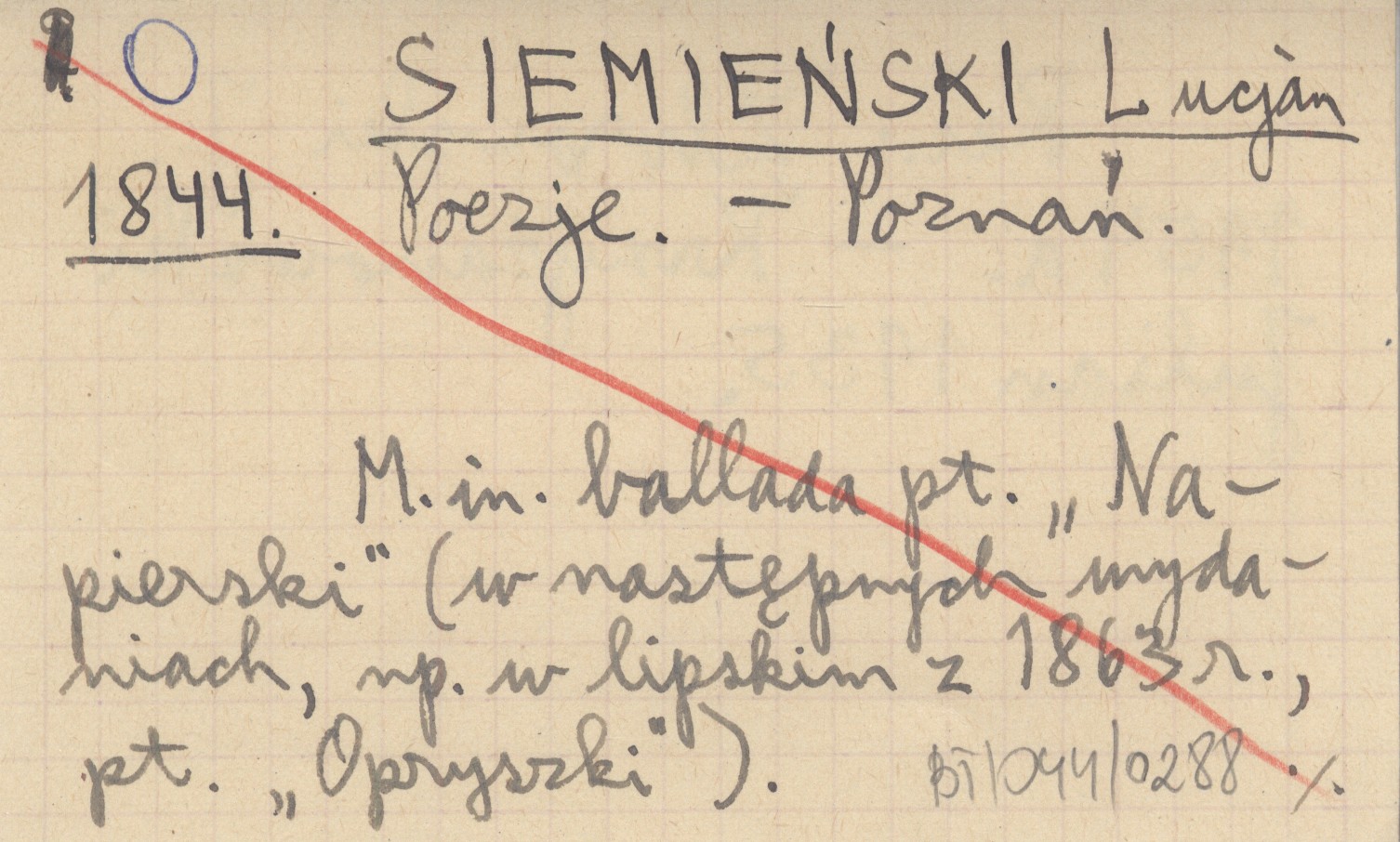 Poznań , M. in. ballada pt. "Napierski" (w następnych wydaniach, np. w lipskim z 1863 r., pt. "Opryszki"). REC: ZBOROWSKI J. 1954 a ; KRZYŻANOWSKI Julian 1935 ;