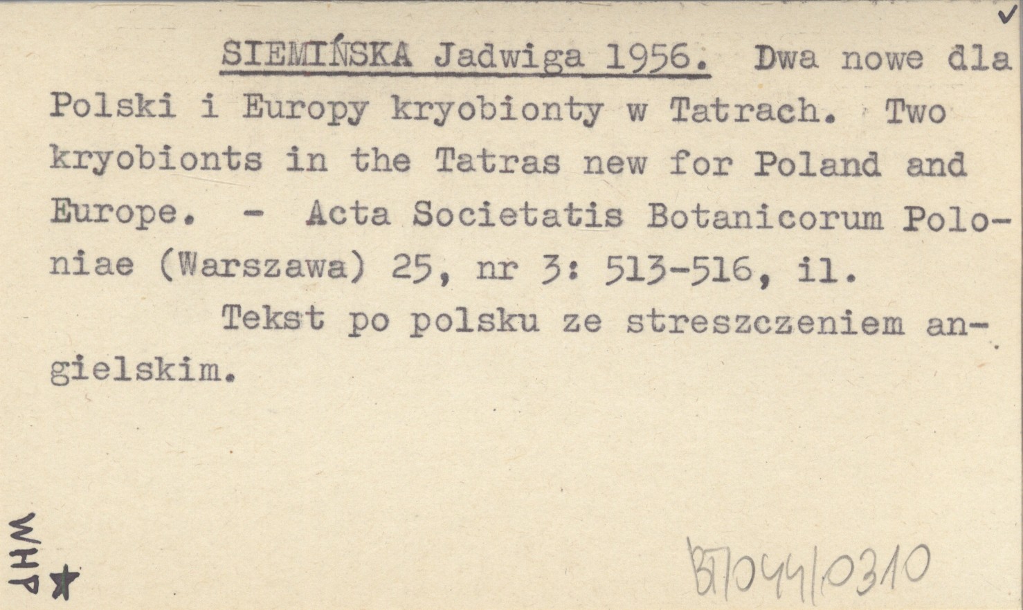 SIEMIŃSKA Jadwiga 1956 Dwa nowe dla Polski i Europy kryobionty w Tatrach. Two kryobionts in the Tatras new for Poland and Europe.