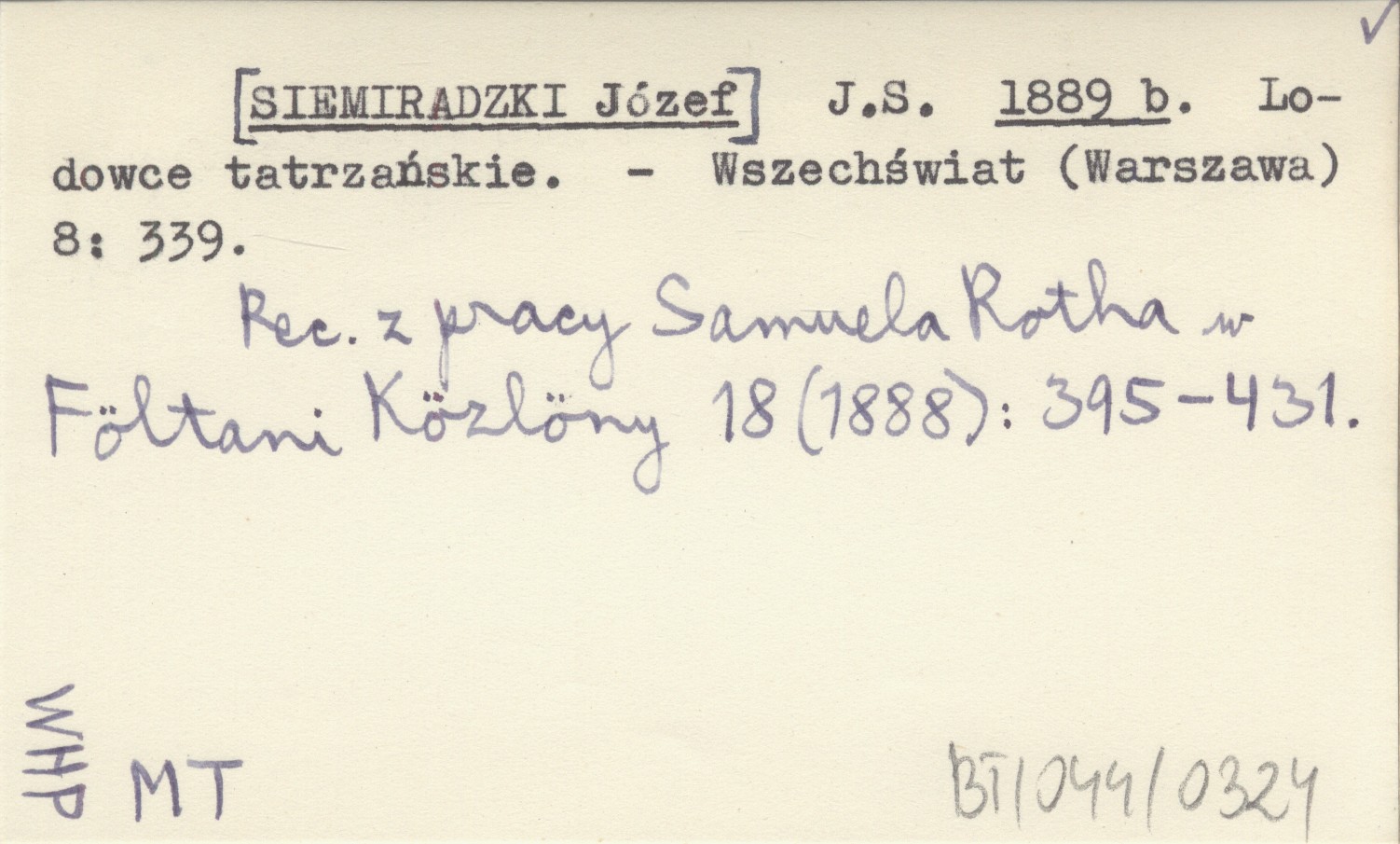 Wszechświat (Warszawa) , 8: 339. Recenzja z pracy Samuela Rotha w Föltani Közlöny 18 (1888): 395-431.