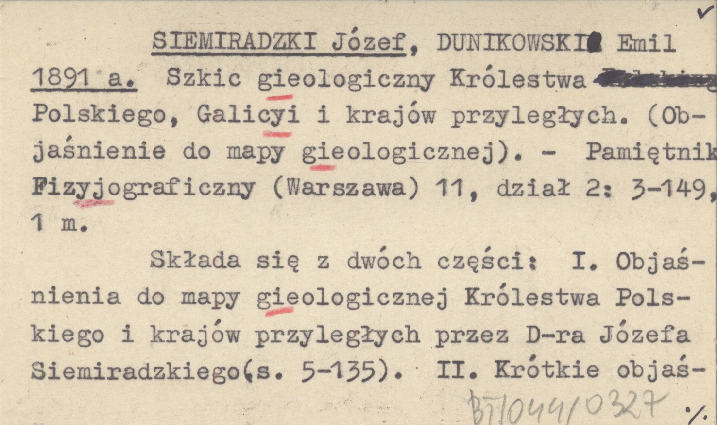 Pamiętnik Fizyograficzny (Warszawa) , 11, dz. 2: 3-149, 1 mapa. Składa się z dwóch części: I. Objaśnienia do mapy gieologicznej Królestwa Polskiego i krajów przyległych przez D-ra Józefa Siemiradzkiego (s. 5-135). II. Krótkie objaśnienie do mapy gielogicznej Karpat i Tatr przez Prof. Dr. E. Dunikowskiego (s. 137-149).