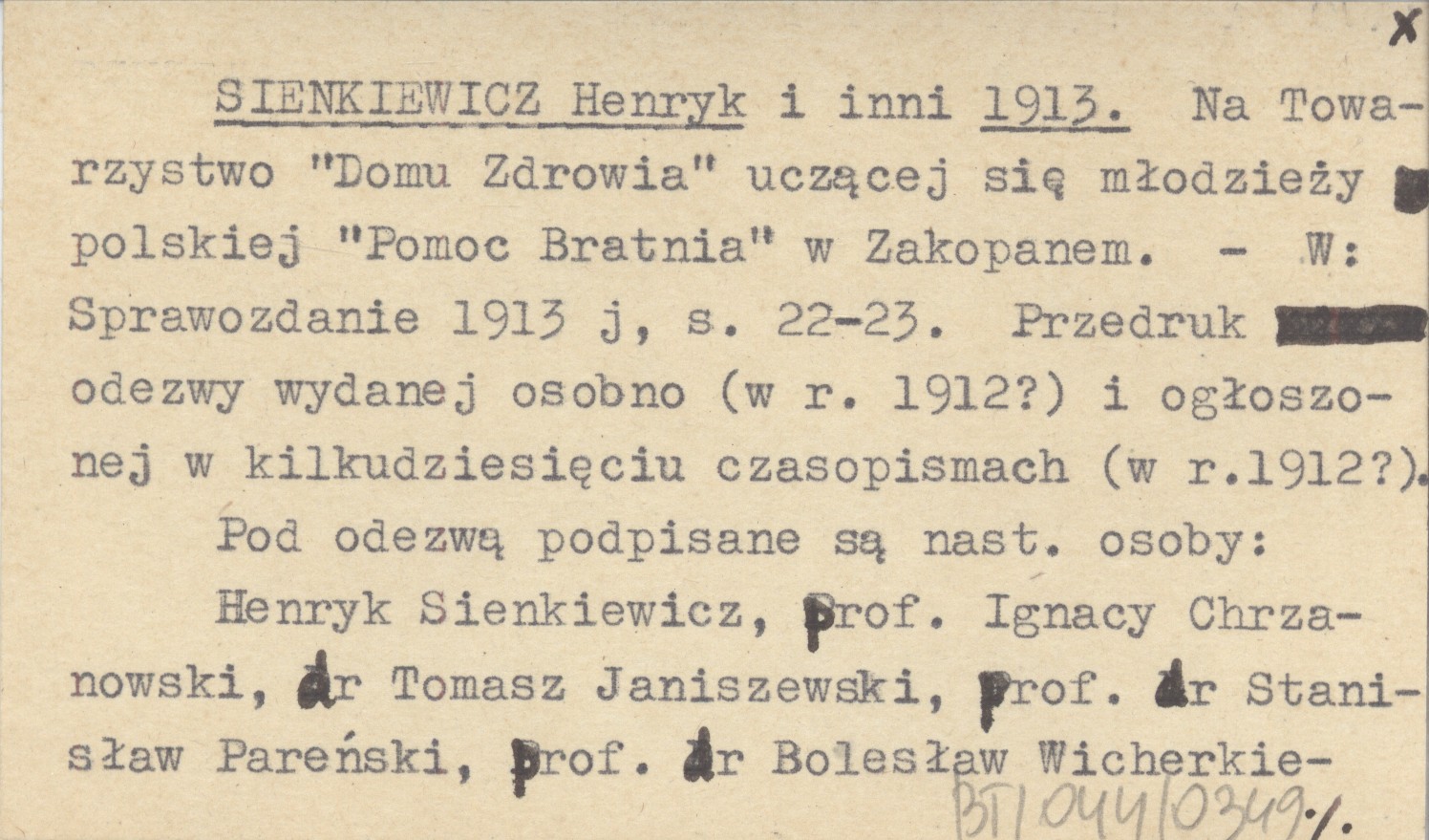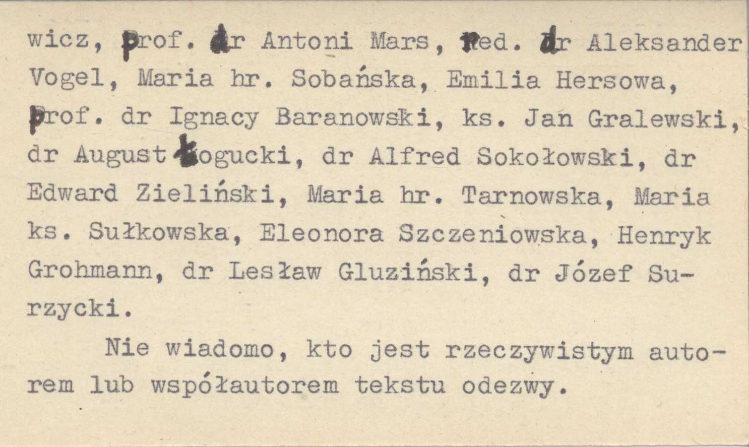 Sprawozdanie 1913 j , S. 22-23. Pod odezwą podpisane są nast. osoby: Henryk Sienkiewicz, prof. Ignacy Chrzanowski, dr Tomasz Janiszewski, prof. dr Stanisław Pareński, prof. dr Bolesław Wicherkiewicz, prof. dr Antoni Mars, red. dr Aleksander Vogel, Maria hr. Sobańska, Emilia Hersowa, prof. dr Ignacy Baranowski, ks. Jan Gralewski, dr August Łogucki, dr Alfred Sokołowski, dr Edward Zieliński, Maria hr. Tarnowska, Maria ks. Sułkowska, Eleonora Szczeniowska, Henryk Grohmann, dr Lesław Gluziński, dr Józef Surzycki. Nie wiadomo kto jest rzeczywistym autorem lub współautorem tekstu odezwy. Przedruk odezwy wydanej osobno (w r. 1912?) i ogłoszonej w kilkudziesięciu czasopismach (w r. 1912?).
