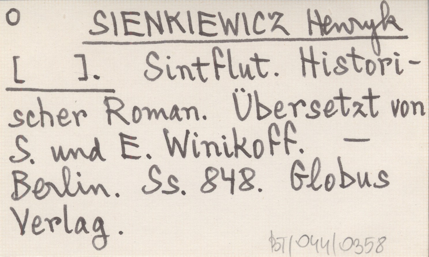 SIENKIEWICZ Henryk Sintflut. Historischer Roman. Übersetzt von S. und E. Winikoff.