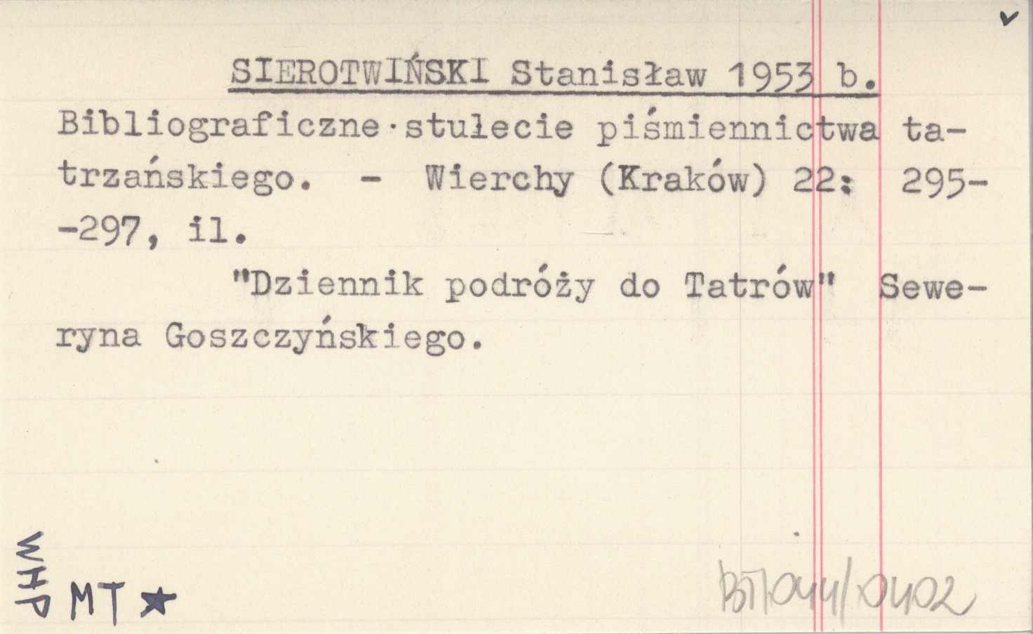 SIEROTWIŃSKI Stanisław 1953 b Bibliograficzne stulecie piśmiennictwa tatrzańskiego.