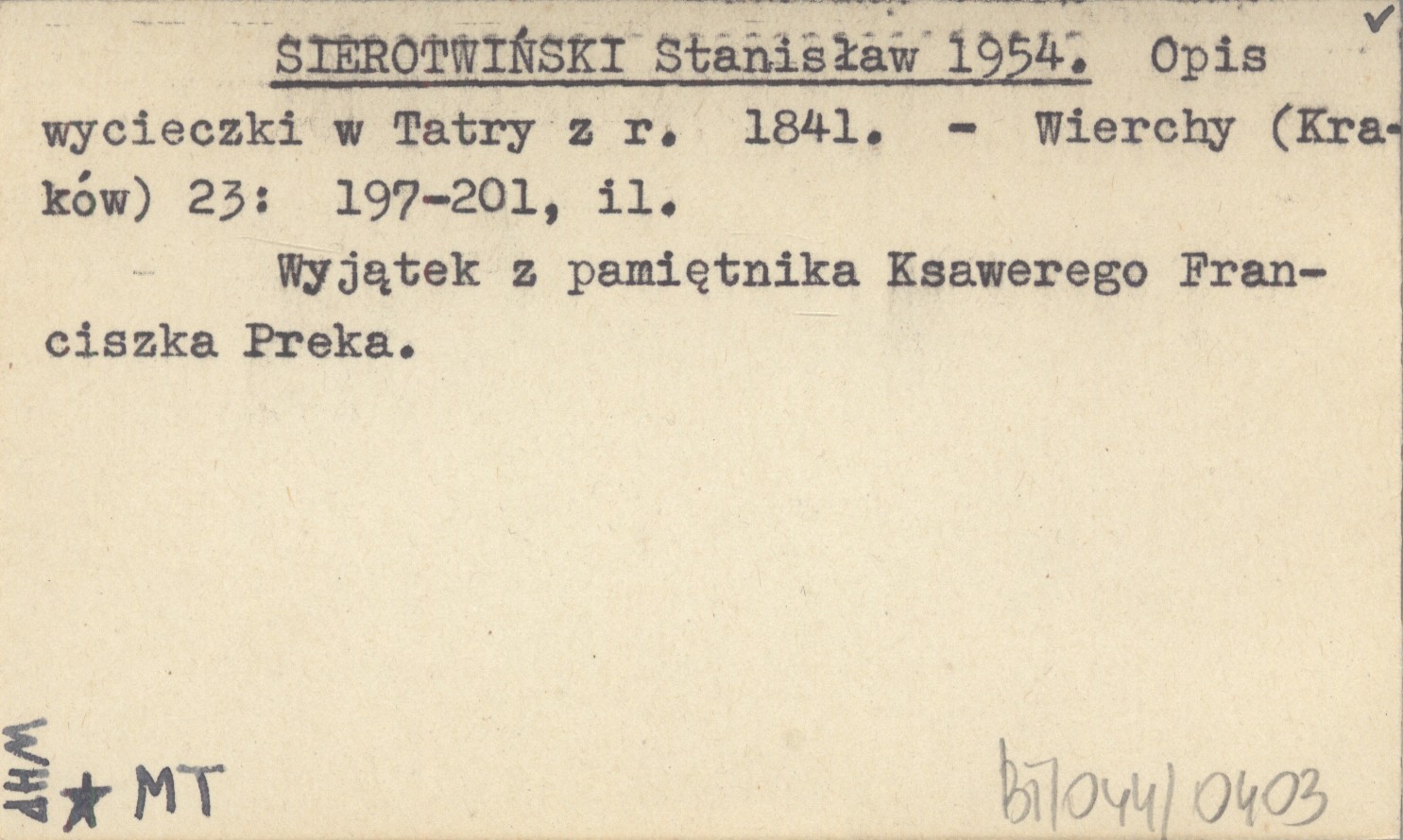 SIEROTWIŃSKI Stanisław 1954 Opis wycieczki w Tatry z r. 1841.