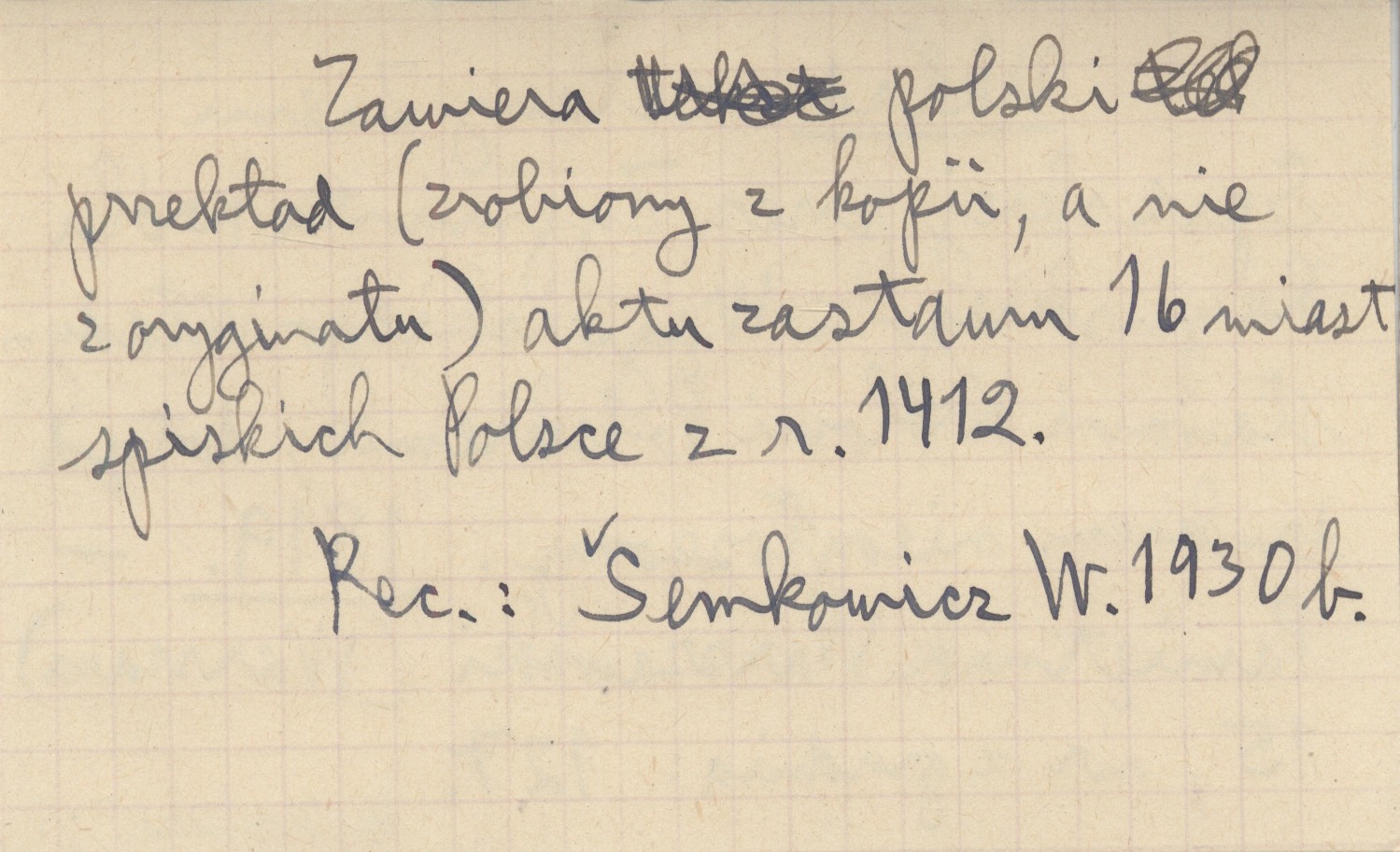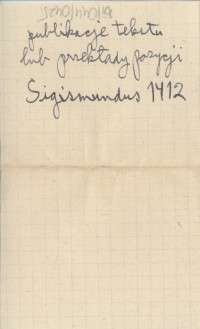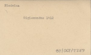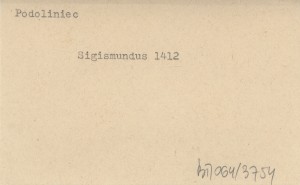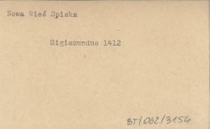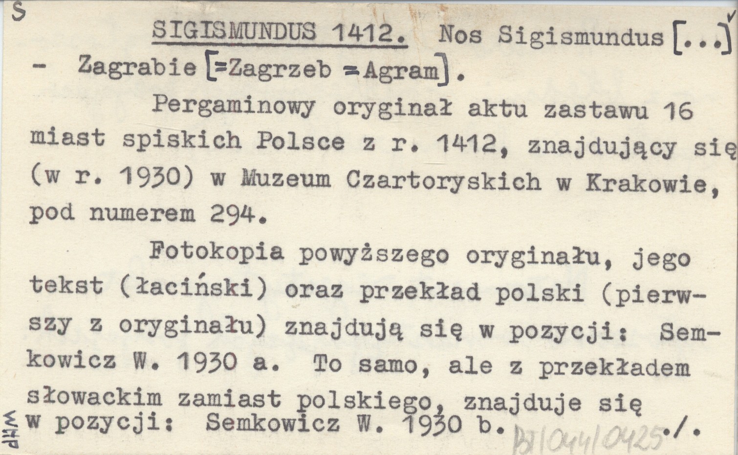 Zagrabie [=Zagrzeb=Agram] , Pergaminowy oryginał aktu zastawu 16 miast spiskich Polsce z r. 1412, znajdujący się (w r. 1930) w Muzeum Czartoryskich w Krakowie, pod numerem 294. Fotokopia powyższego oryginału, jego tekst (łaciński) oraz przekład polski (pierwszy z oryginału) znajdują się w pozycji: SEMKOWICZ W. 1930 a. To samo, ale z przekładem słowackim zamiast polskiego, znajduje się w pozycji: SEMKOWICZ W. 1930 b. Ponadto teksty tego aktu ogłoszono z błędami w następujących pozycjach (po łacinie lub w przekładzie): . Natomiast regestry tego aktu ogłoszono w następujących pozycjach: BEL M. 1723: 106-108, DZIEDUSZYCKI Maurycy 1876: 694-97, DU MONT J. 1739, PRAY G. 1768, KERCHELICH Baltazar [ok. 1770], WAGNER K. 1774, KATONA A. 1790.
